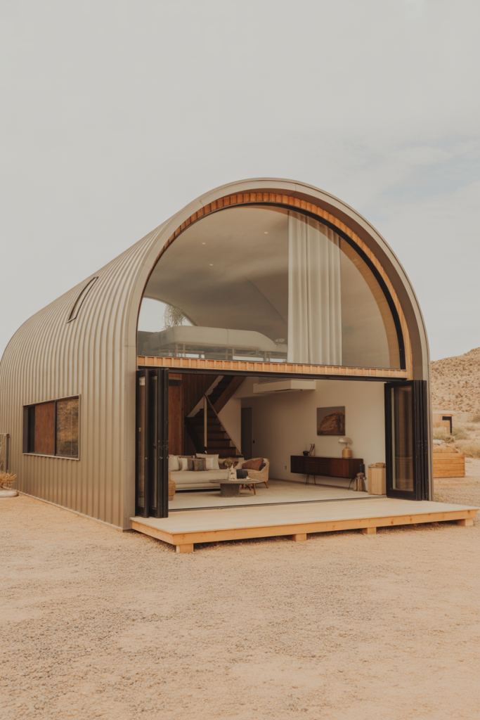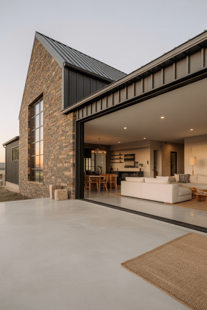 Inspired by southwestern architecture, this modern barndominium features sand-toned stucco and clay-hued exterior colors that blend into desert or prairie settings. The interiors keep a neutral palette with terracotta accents, airy ceilings, and large sliding doors that merge indoor and outdoor life. The floor plans emphasize flow and natural light, making this design ideal for dry, sunny climates.