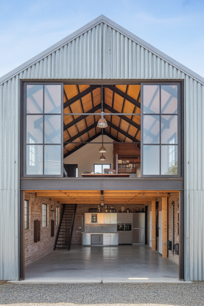 Think downtown loft meets country barn. This two-story modern design features a steel-frame exterior, tall windows, and an open mezzanine on the upper level. Inside, raw brick and metal details define the interiors, with a central kitchen and a garage tucked neatly below. Perfect for creatives who want urban edge with rural freedom.