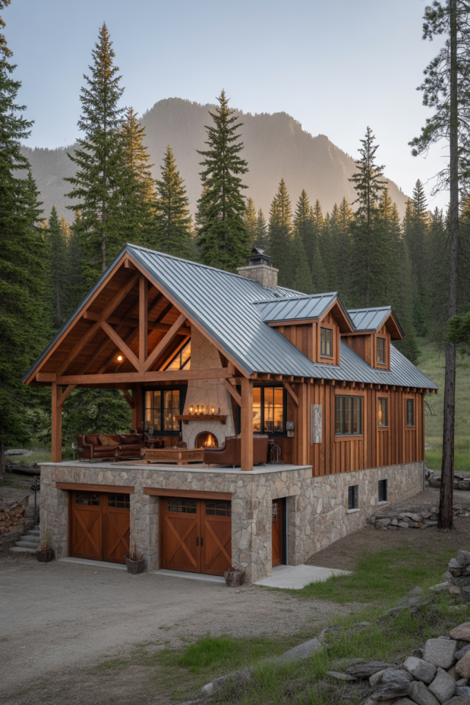 6. Mountain Retreat Barndominium with Stone and Timber Exterior