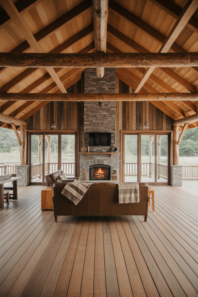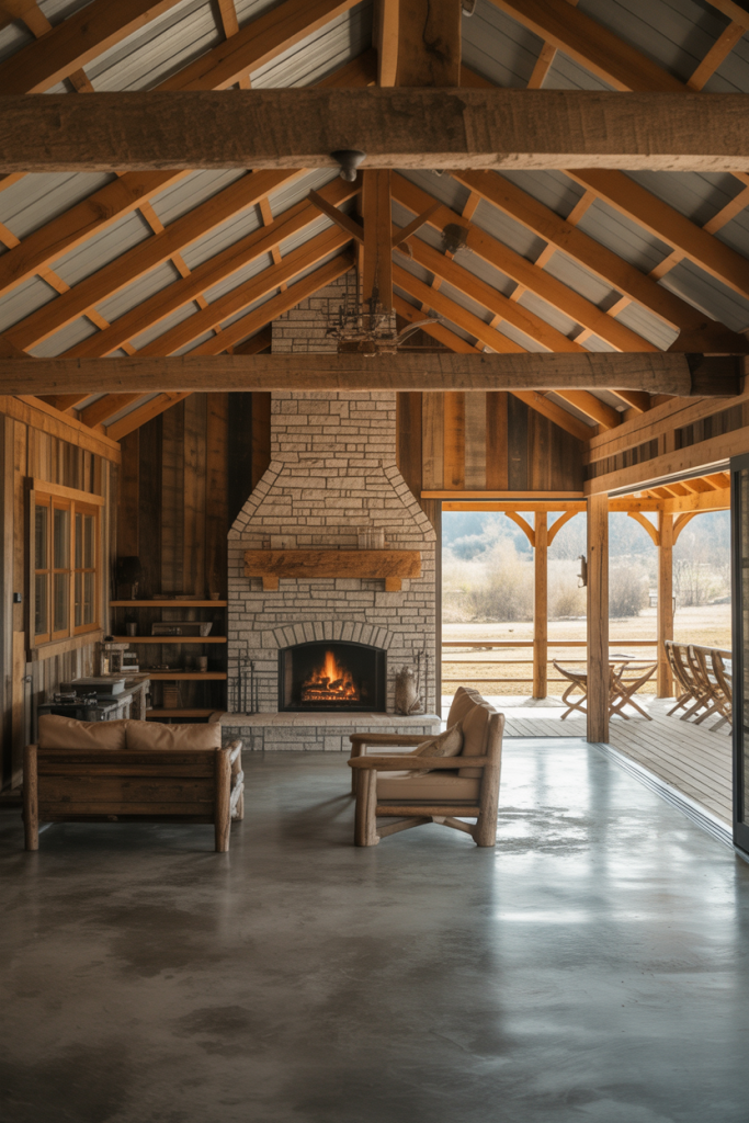 In this version, the barndominium embraces a rustic cabin aesthetic: exposed wood beams, reclaimed plank walls, and warm tones throughout the interiors rustic living spaces. A dedicated shop or workshop space attaches to the building, making it perfect for hobbyists or homeowners who need dual-purpose space. Upstairs lofts act as extra bedrooms or studio space. The floor plans emphasize functionality and comfort, giving off a laid-back retreat vibe.