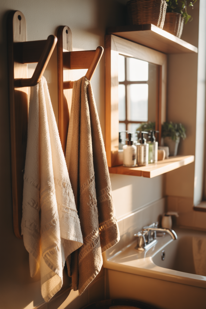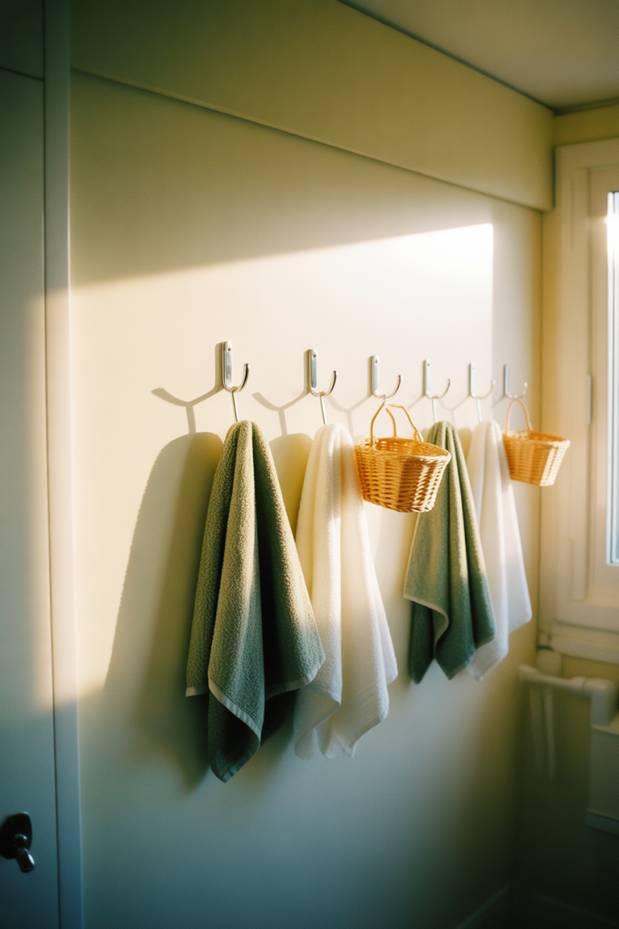 In a true small-space bathroom, hooks can do more than hold towels. Adding a row of strategically placed hooks can provide vertical storage for robes, baskets, or other everyday items. It’s an easy way to unclutter cabinets and keep frequently used items more accessible, which is useful in tight spaces.