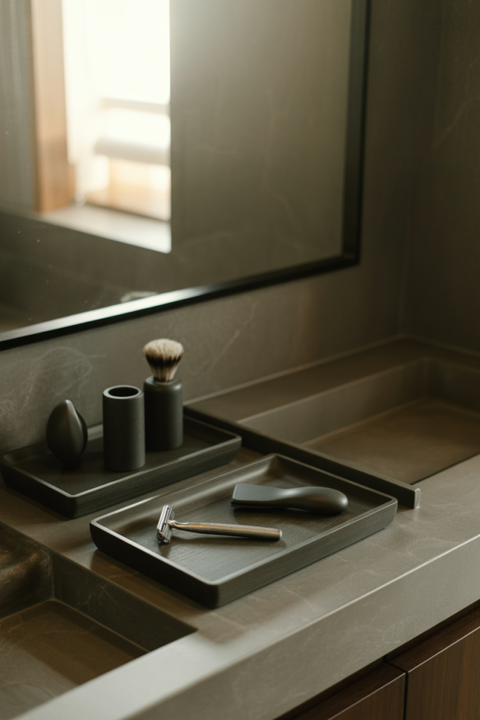 Men’s bathrooms, generally, do best with less and a more straightforward system. This concept centers on men’s grooming essentials with organization in shallow trays and basic display containers. By restricting the number of categories and ensuring visibility, everyday tasks become streamlined and more purposeful. The style is clean and straightforward, matching the elegance of modern living, and doesn’t go overboard on the details of storage, which is often the place where simplicity is often invaluable.