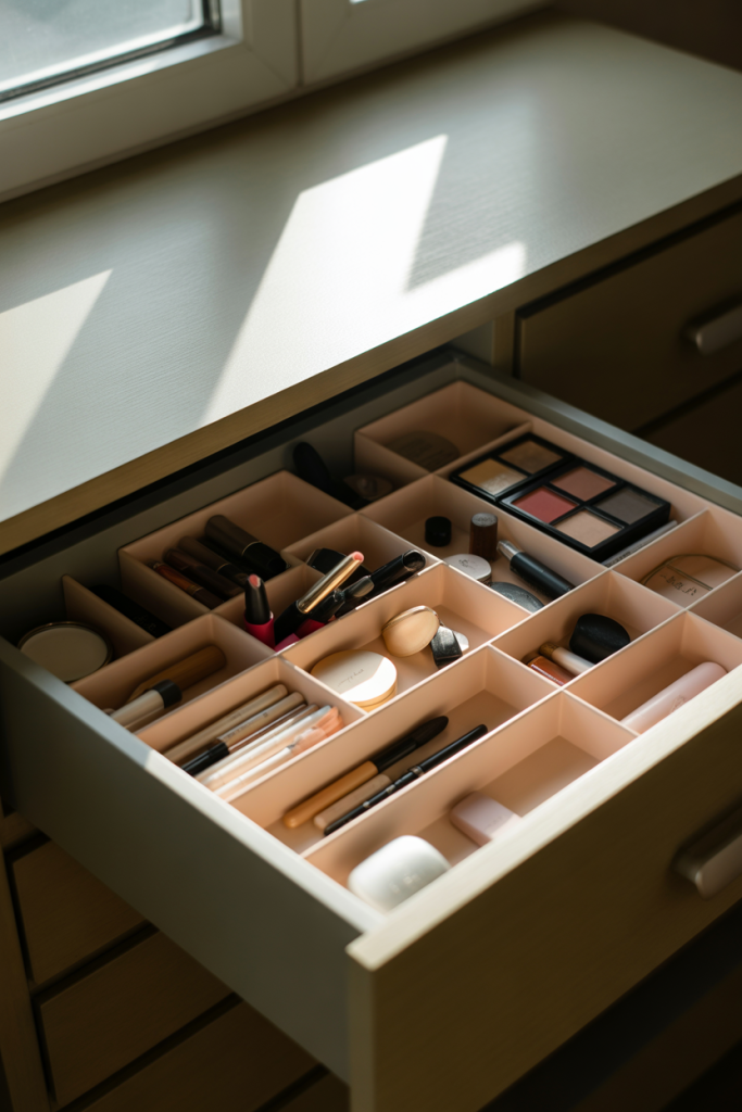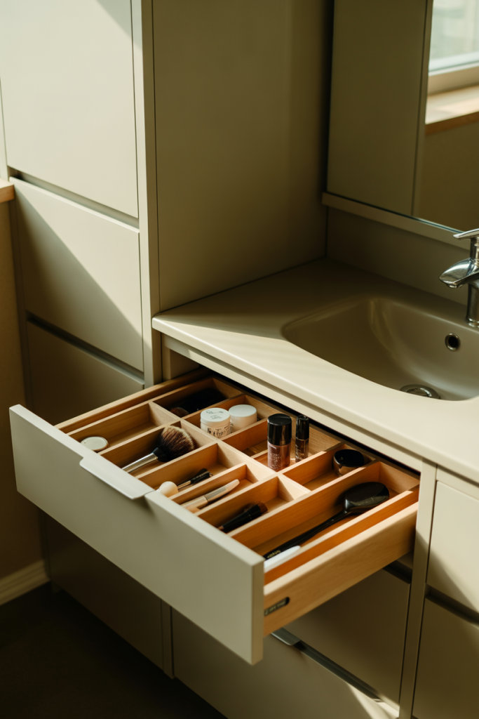 Bathroom drawers often become catch-alls unless they’re given structure. Using simple dividers turns drawers into reliable storage for ideas and drawer layouts that actually last. This works especially well for organizing makeup and tools that otherwise shift around. The result feels intentional rather than improvised, which is key for small bathrooms trying to stay visually calm.