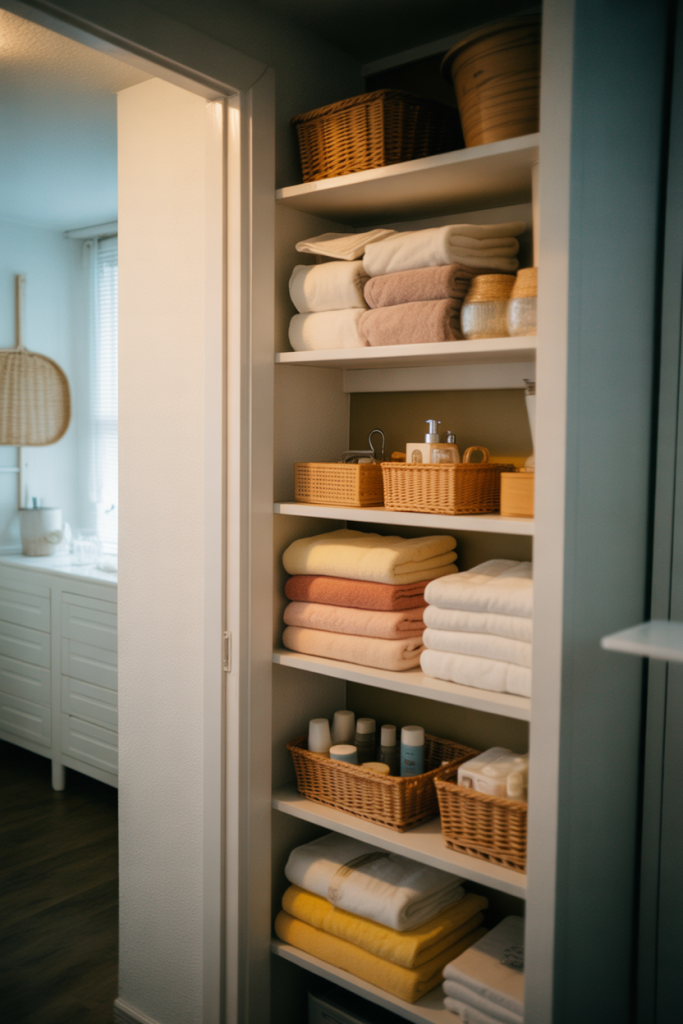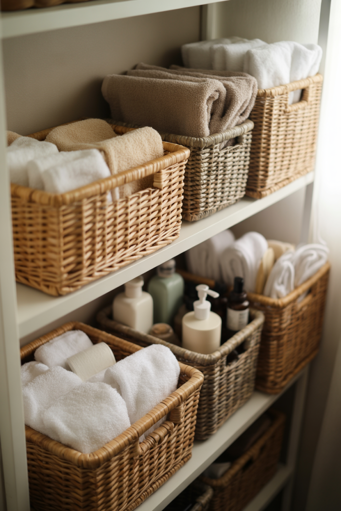 A well-organized The guest bathroom should feel welcoming, not overstuffed. Limiting storage to essentials keeps the space calm and easy to navigate. Simple baskets with towels and toiletries provide comfort without clutter. Thoughtful ideas like this elevate even small powder rooms.