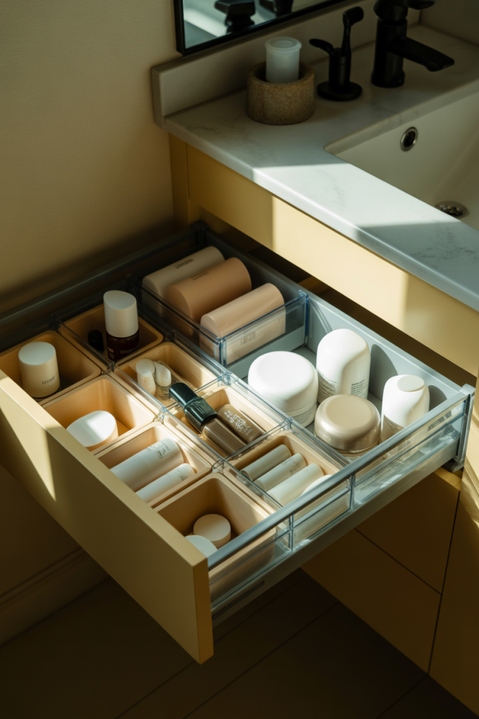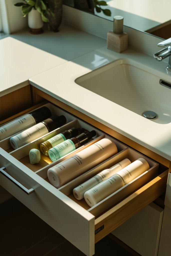 Practical insight: storing skincare horizontally in drawers protects products from excess light and heat. Homeowners who switch from countertops to drawers often notice longer product life and a calmer visual environment.