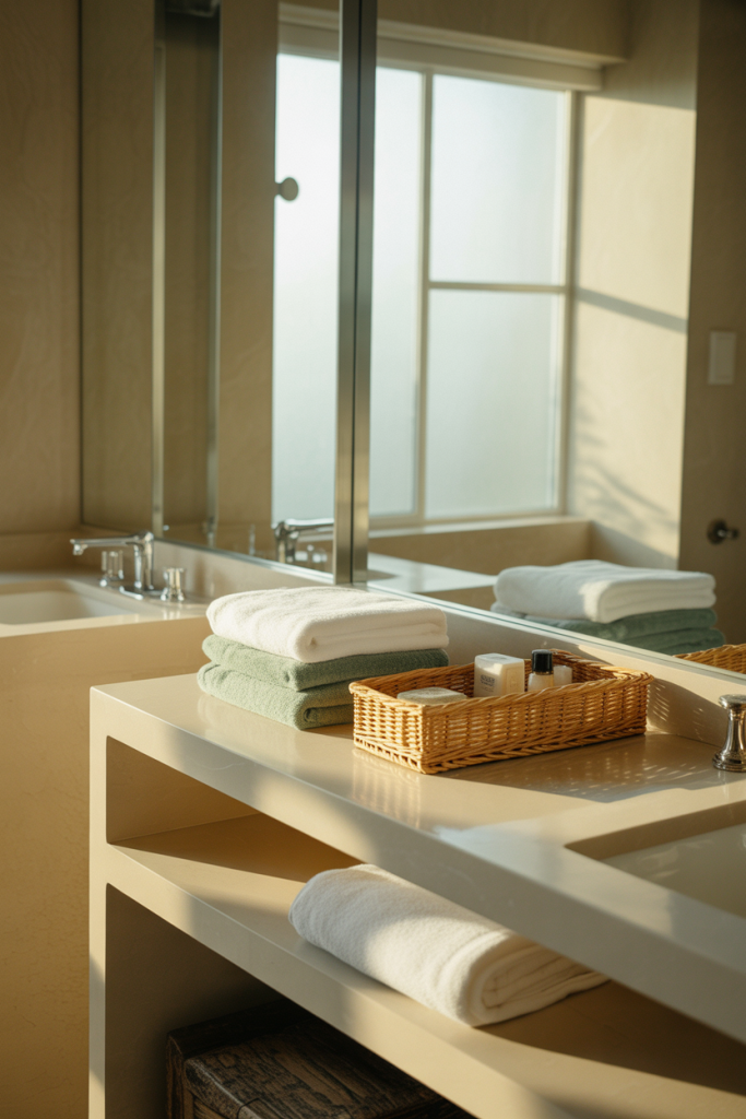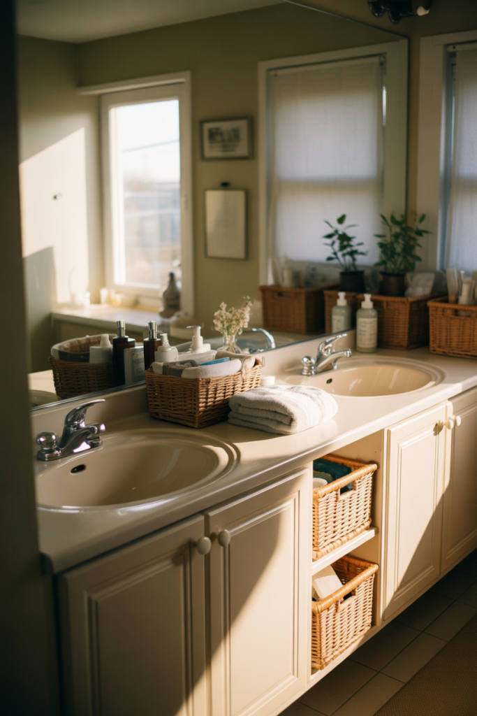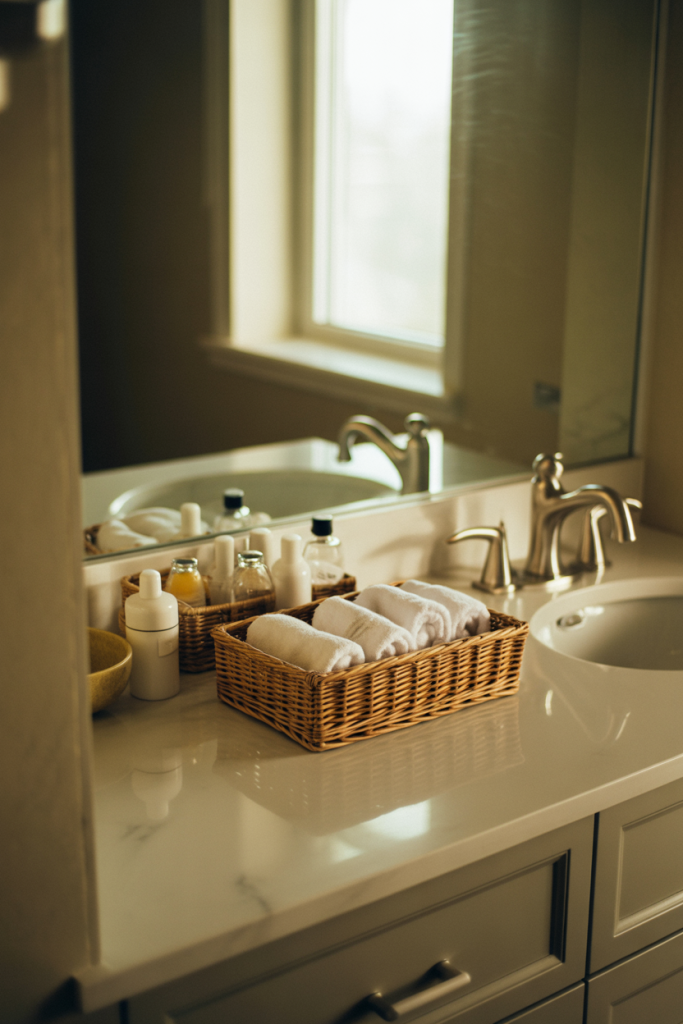 A guest bathroom benefits from simple countertop baskets holding essentials only. This keeps items visible and welcoming without overwhelming visitors. It’s an easy upgrade that makes guests feel considered and comfortable.
