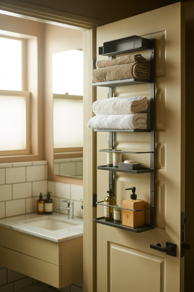 When cabinets feel full, the inside of doors becomes an overlooked asset. Adding slim organizers inside cabinet doors is a powerful small-space solution that doesn’t change the room visually. This approach works well for hair tools, cleaning sprays, or backup supplies, keeping essentials hidden but reachable.