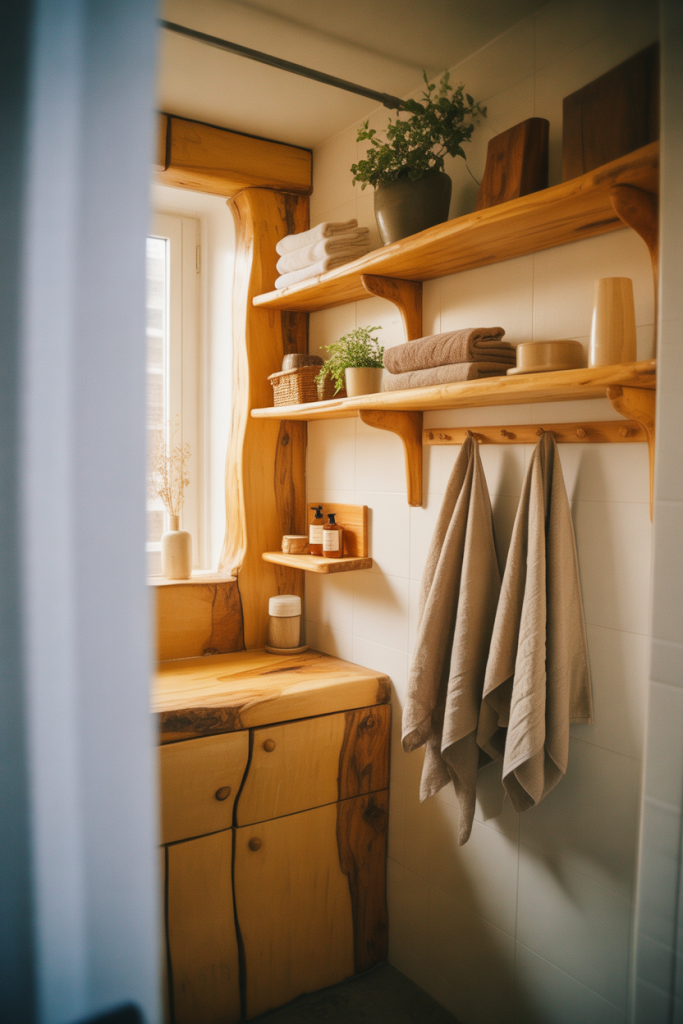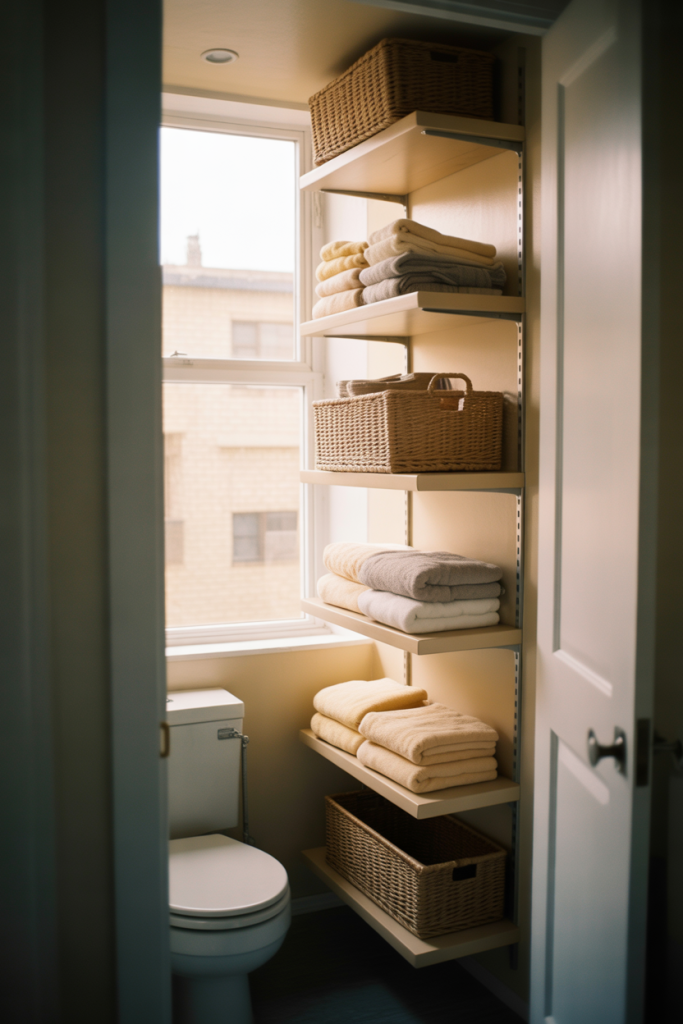 When square footage is limited, walls become valuable real estate. Vertical shelves offer storage without taking away from the floor space, which makes them ideal for tiny bathrooms. Slim profiles of the shelves make it so the room won’t feel cluttered, while also being able to hold towels, baskets, and other supplies. This idea pairs clutter management with a functional, relaxing feel.