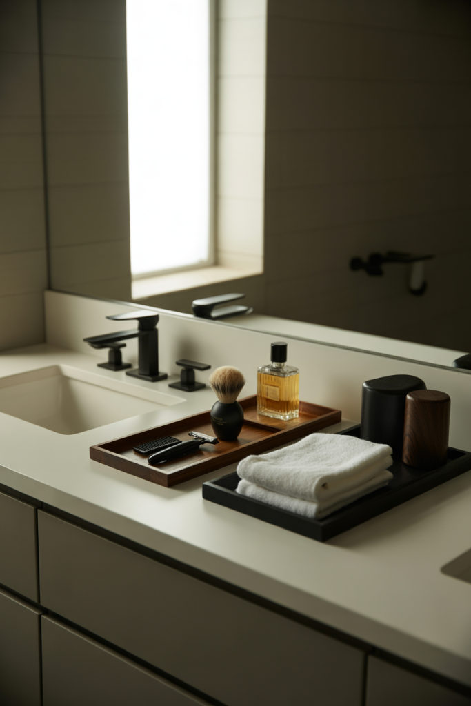 Men’s bathrooms, generally, do best with less and a more straightforward system. This concept centers on men’s grooming essentials with organization in shallow trays and basic display containers. By restricting the number of categories and ensuring visibility, everyday tasks become streamlined and more purposeful. The style is clean and straightforward, matching the elegance of modern living, and doesn’t go overboard on the details of storage, which is often the place where simplicity is often invaluable.
