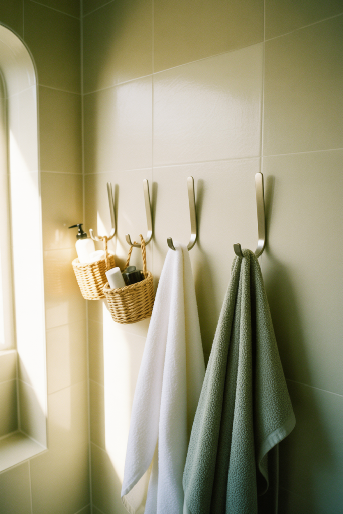 In a true small-space bathroom, hooks can do more than hold towels. Adding a row of strategically placed hooks can provide vertical storage for robes, baskets, or other everyday items. It’s an easy way to unclutter cabinets and keep frequently used items more accessible, which is useful in tight spaces.