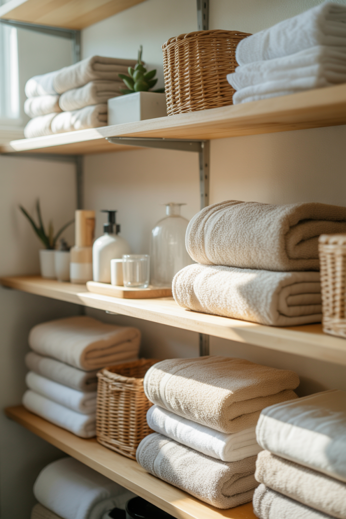 Pinterest-style Inspo often leans on open shelving done right. Balanced styling with baskets, towels, and negative space keeps shelves functional without feeling staged. This idea blends beauty and everyday use, especially in bathrooms that double as guest spaces.