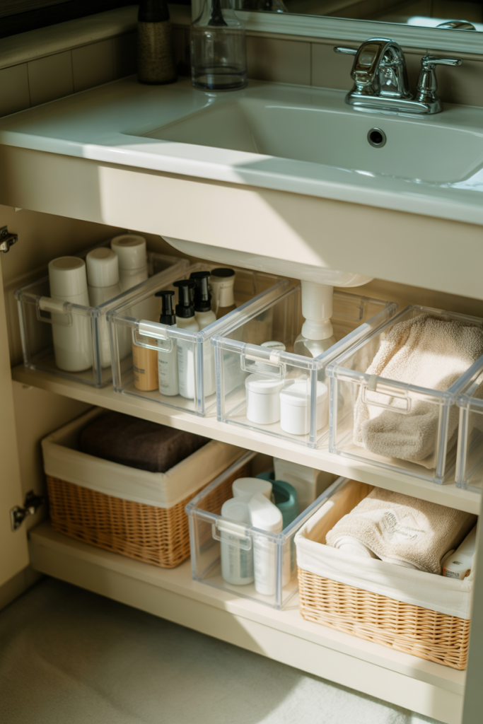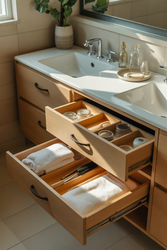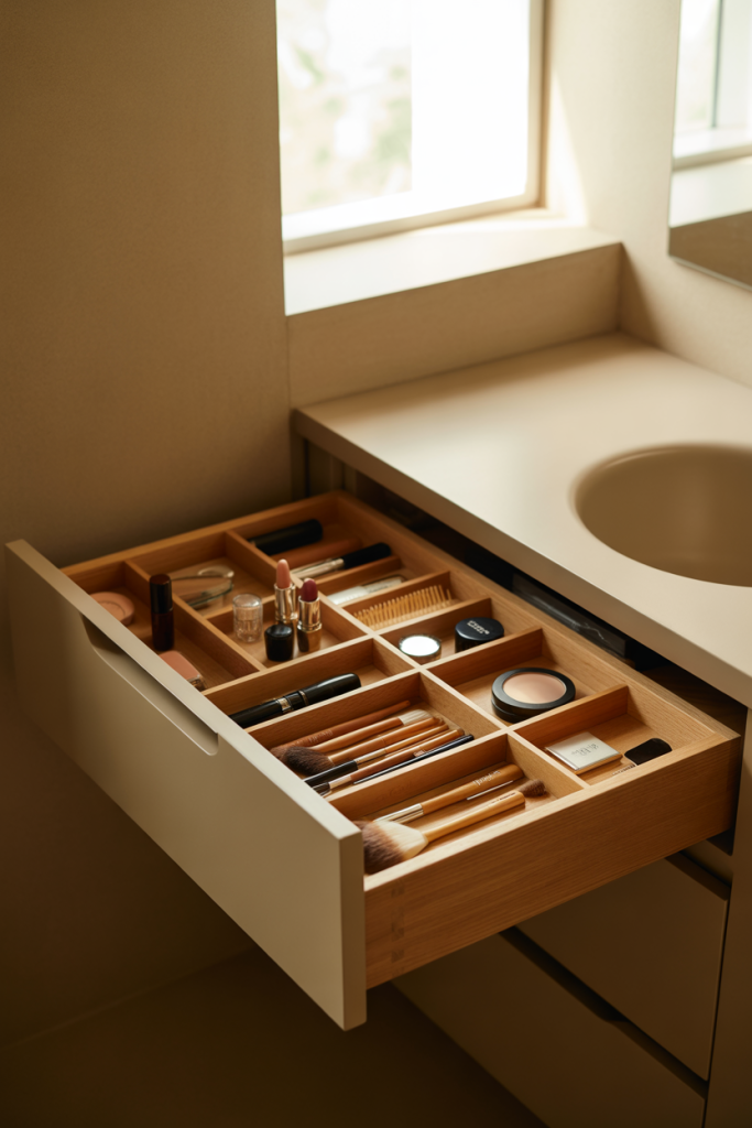 Bathroom drawers often become catch-alls unless they’re given structure. Using simple dividers turns drawers into reliable storage for ideas and drawer layouts that actually last. This works especially well for organizing makeup and tools that otherwise shift around. The result feels intentional rather than improvised, which is key for small bathrooms trying to stay visually calm.