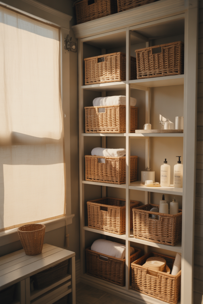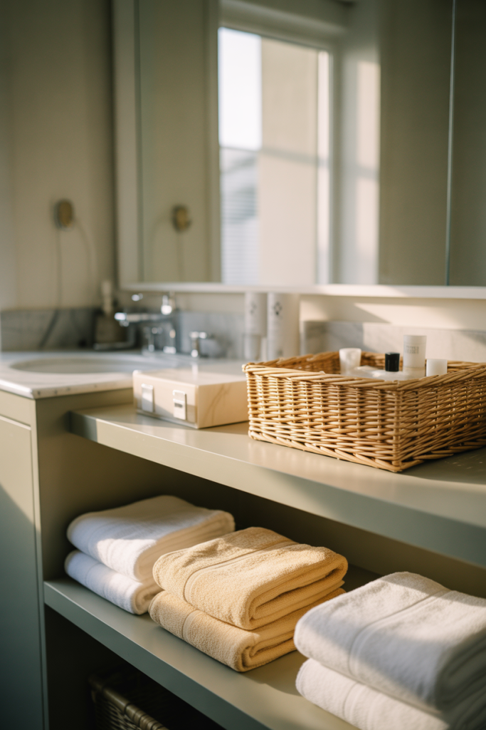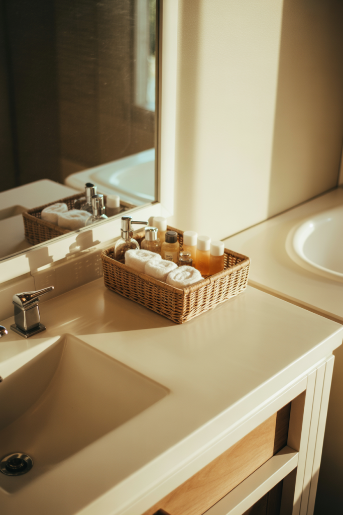 A guest bathroom benefits from simple countertop baskets holding essentials only. This keeps items visible and welcoming without overwhelming visitors. It’s an easy upgrade that makes guests feel considered and comfortable.