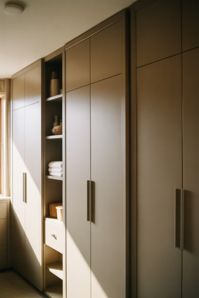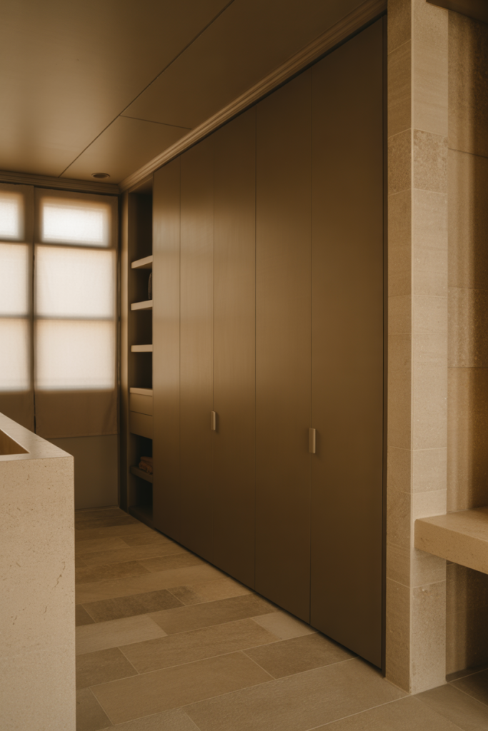 High-end homes often treat bathrooms like dressing spaces. Integrating luxury closet-style storage keeps towels, robes, and supplies perfectly organized. Clean lines and matching finishes elevate the entire room while keeping everything hidden.