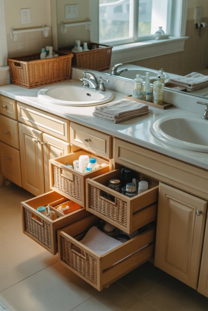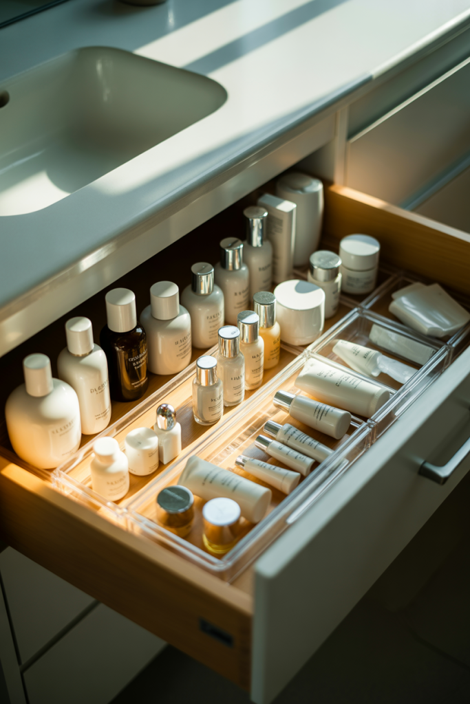 Morning routines run smoother when products are easy to find and return. This idea centers on organizing skincare inside shallow drawers instead of leaving bottles on display. Grouping items by routine rather than brand keeps things intuitive and calm. It’s a smart solution for anyone who wants a tidy look without sacrificing daily convenience, especially in bathrooms used every day.