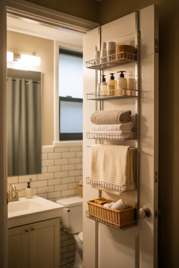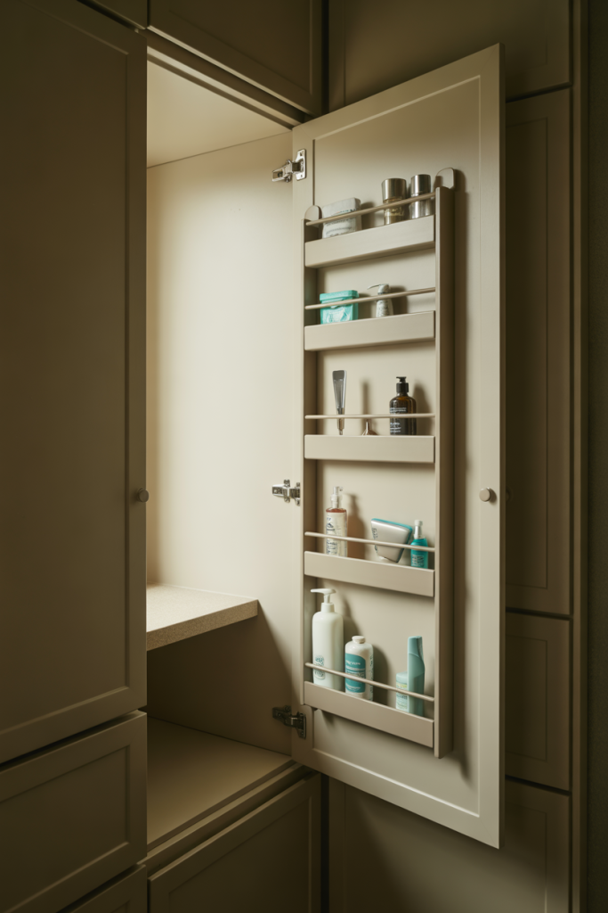 When cabinets feel full, the inside of doors becomes an overlooked asset. Adding slim organizers inside cabinet doors is a powerful small-space solution that doesn’t change the room visually. This approach works well for hair tools, cleaning sprays, or backup supplies, keeping essentials hidden but reachable.