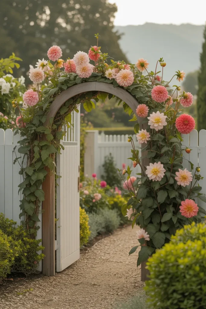 A blooming entry framed in Cottage style sets a romantic tone before guests even reach the door. Arched trellises and layered Dahlia clusters bring vintage charm, while a relaxed Layout keeps the scene from feeling staged. The soft Aesthetic works especially well with classic American architecture.