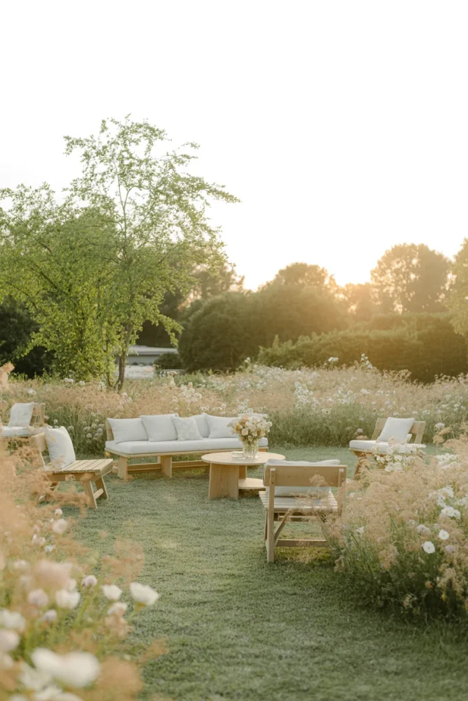 A softly untamed Wild meadow offers a relaxed counterpoint to structured lawns. Layered grasses and mixed blooms create a gently immersive Background for outdoor dinners. The natural Aesthetic feels free-spirited yet thoughtfully composed, delivering endless Inspiration for laid-back gatherings.
