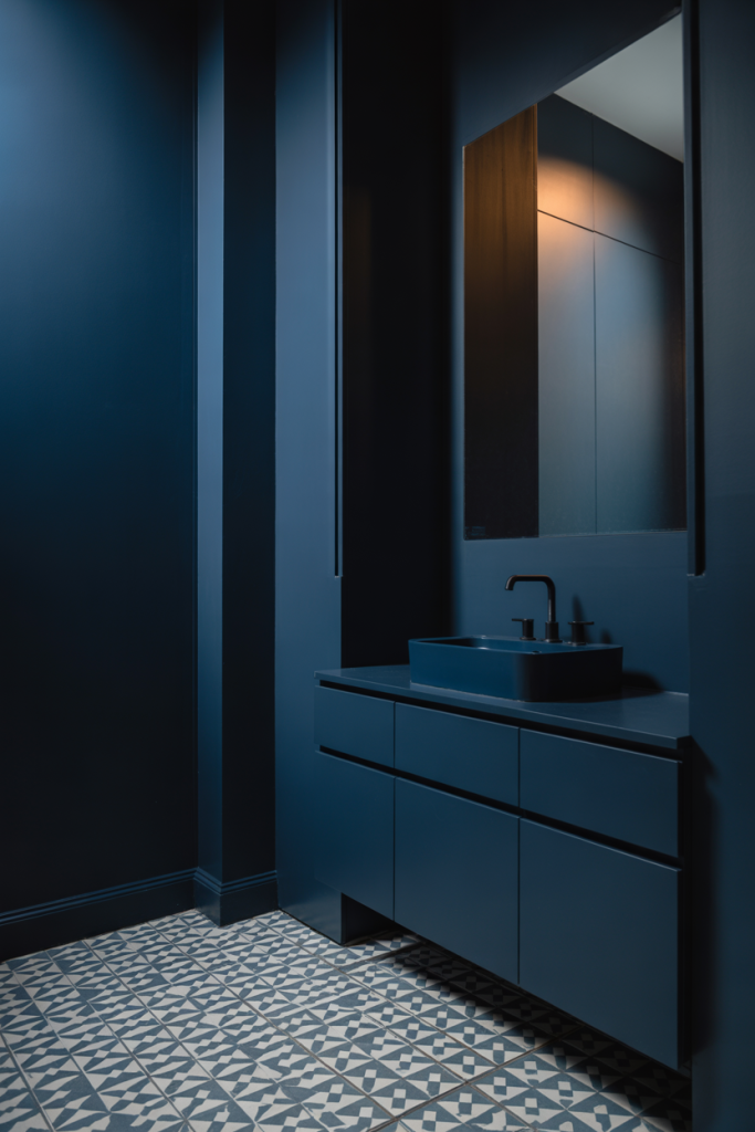 Combining dark blue and patterned tiles creates visual energy and depth. The dark tiles anchor the space, and the patterned tiles add movement. This is ideal for those who want a bold design that isn’t too overpowering.