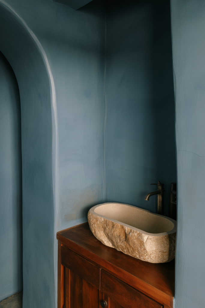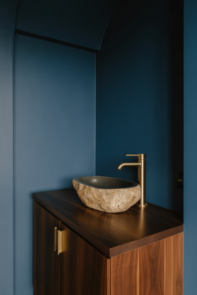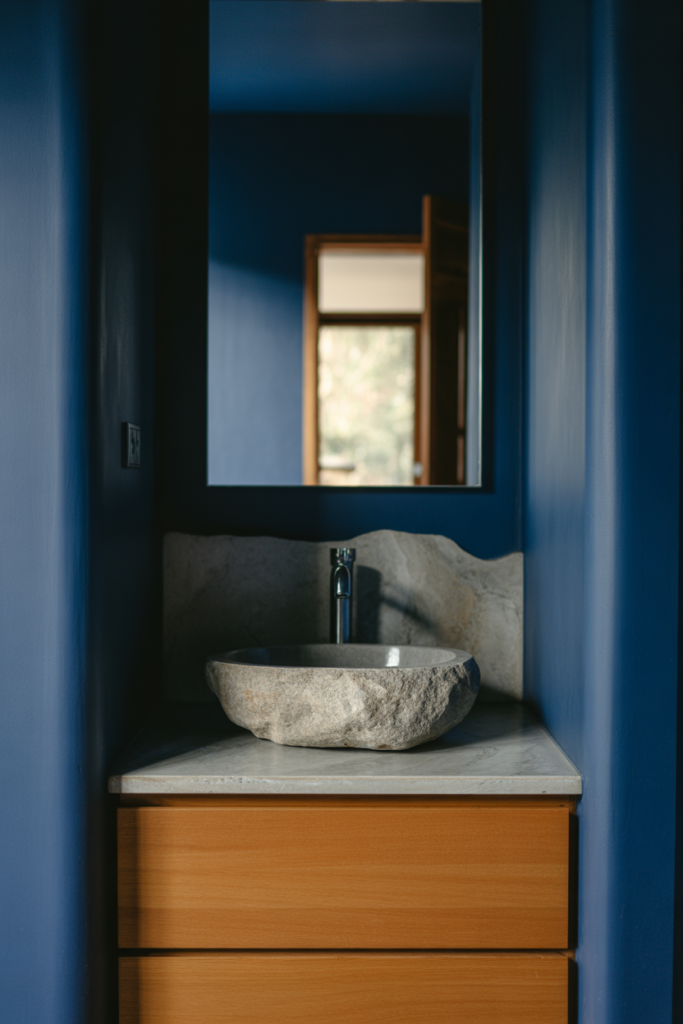 Using dark blue alongside natural stone creates a grounded, architectural feel. The richness of the color contrasts beautifully with organic textures, giving the bathroom depth without visual heaviness. This approach feels refined and confident rather than dramatic for its own sake.
