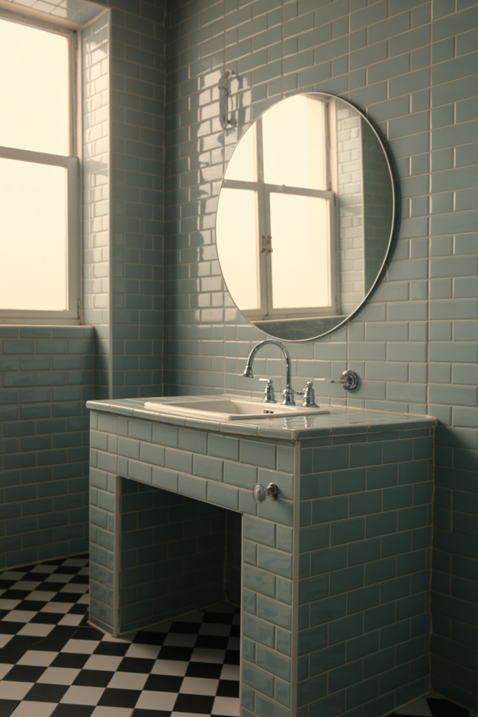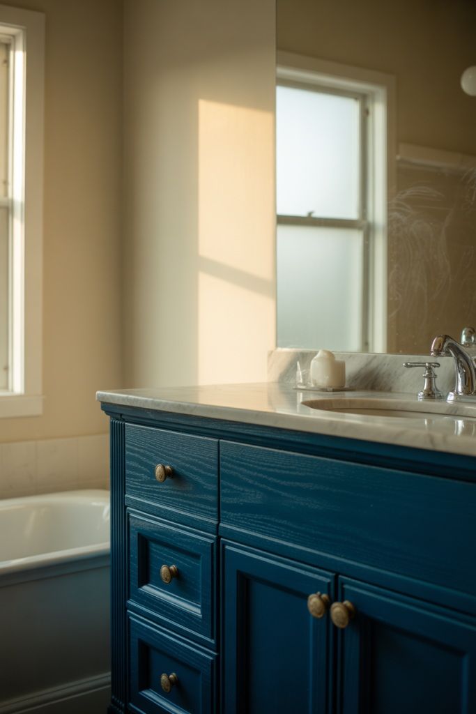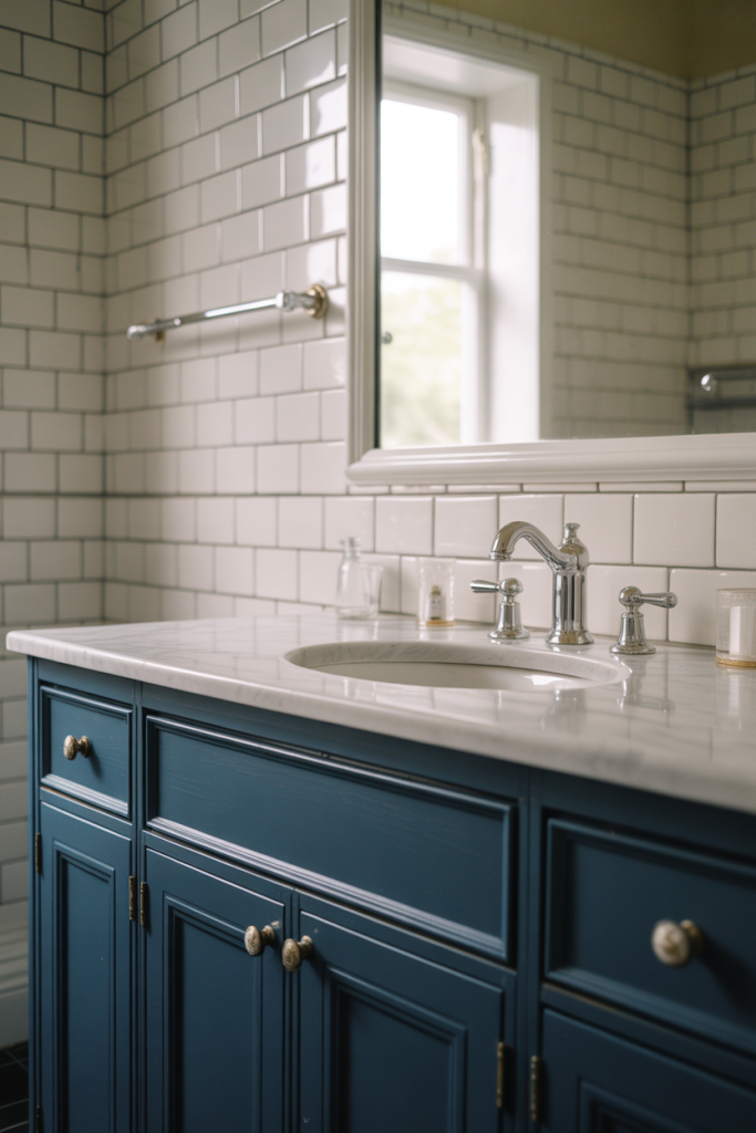 This is a budget-conscious way to introduce color. Painting or replacing a vanity costs significantly less than retiling walls, yet it still delivers a strong visual impact.