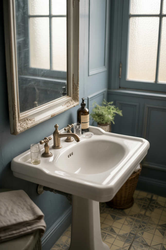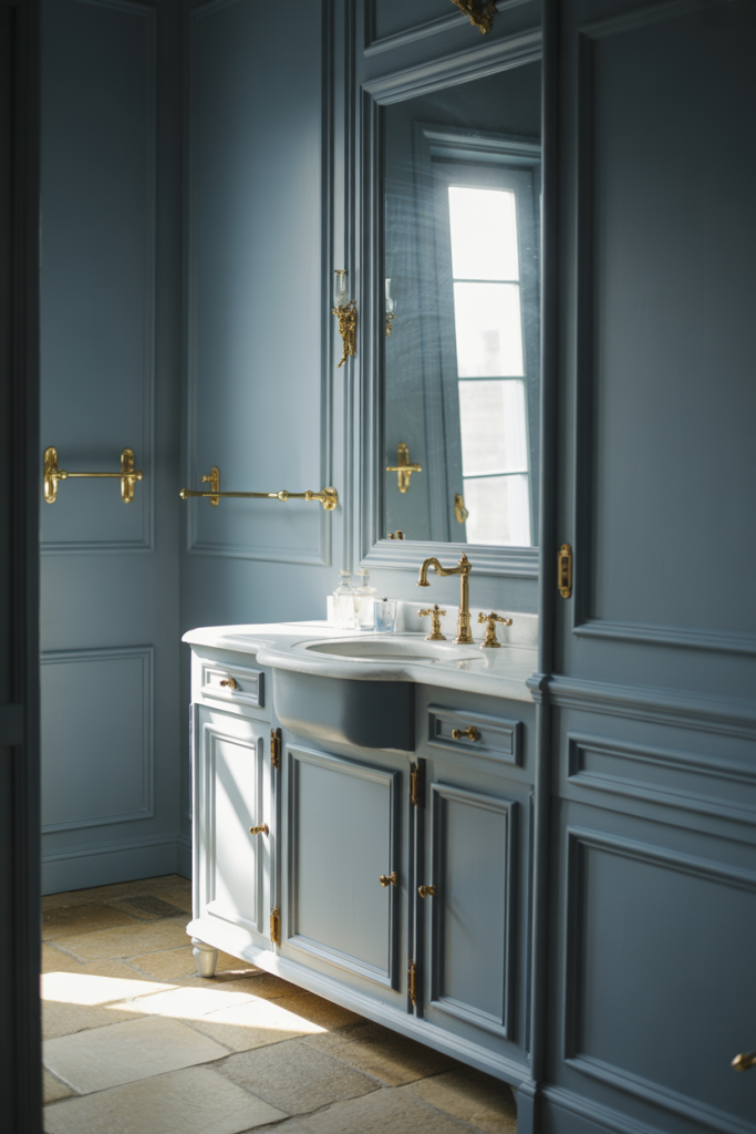 This style often emerges naturally in real homes where owners mix old and new over time. A hand-me-down mirror, reclaimed hardware, or antique light fixture can become the starting point, with dusty blue acting as the unifying backdrop rather than the main attraction.