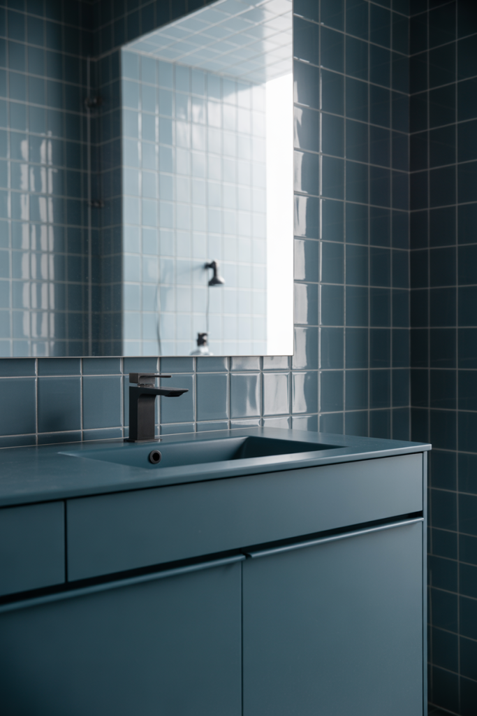 Using dark blue without layering with light is a place where many go wrong. Integrate reflective surfaces like mirrors, glossy tiles, or metal fixtures to avoid a flat look. These elements bounce light softly, keeping the room dramatic but comfortable and usable.
