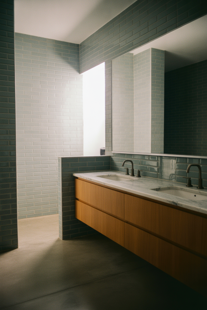 Blue and grey are combined and draw upon a palette of soft calmness that is architectural and composed. Clean lines and balanced proportions reinforce the sense of order, making the bathroom feel intentional rather than decorative. Mixing too many undertones is a common mistake. Staying in one temperature range keeps the space cohesive and prevents the colors from competing with one another.