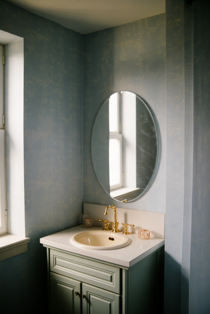 Dusty blue shines when paired with subtle decor choices that feel collected, not styled. Soft textiles and rounded forms help the color read warm rather than cool, making the bathroom feel lived-in and approachable.
