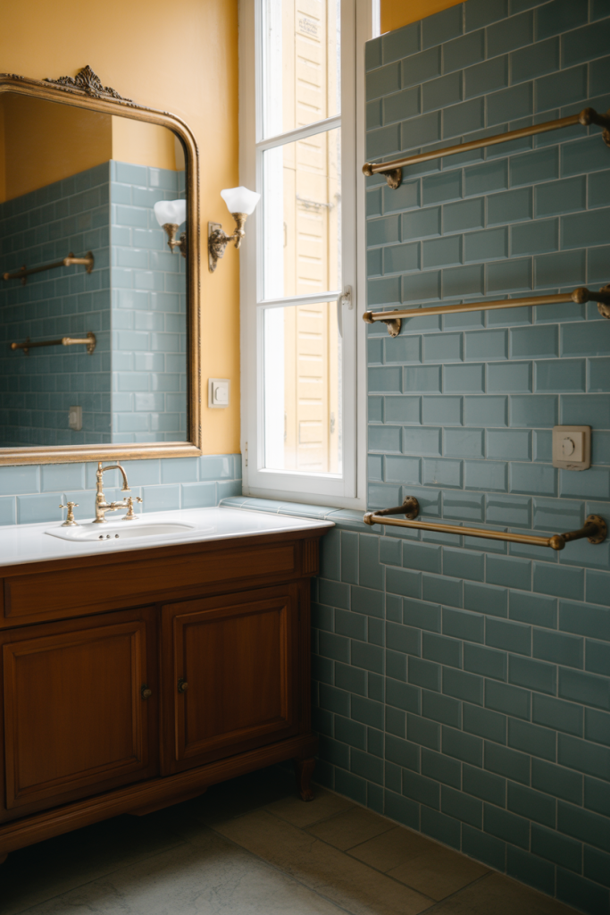 Bathrooms inspired by French design tend to utilize layered materials and gentle color palettes. Blue tiles and subtle French influences like rounded mirrors or vintage-style fixtures evoke a timeless European aesthetic. It’s a romantic design style that is sensibly downtrodden and not overdone.