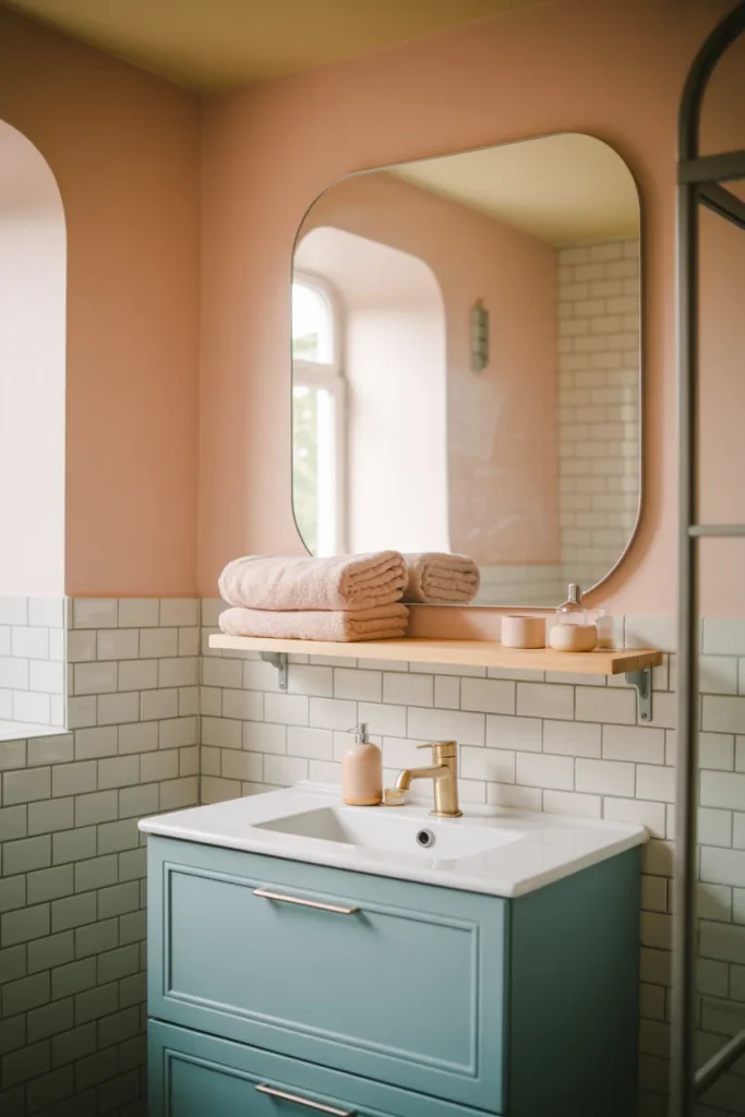 A blush-toned bathroom instantly feels uplifting, especially in Small spaces where every detail matters. Think pale Pink tiles, curved mirrors, and subtle brass accents that lean into a gentle Aesthetic. This look works beautifully in an Apartment where bold renovations aren’t possible, but paint, peel-and-stick tile, and textiles can do the heavy lifting. The result is sweet without being childish.