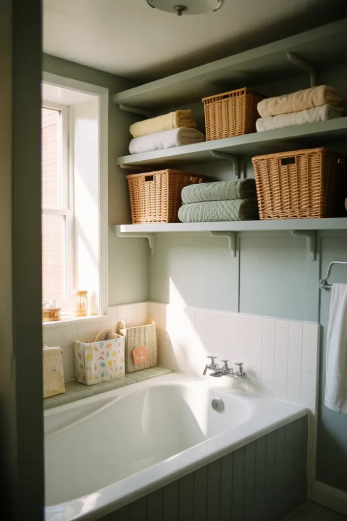 For families with Kids, adding open shelving in bright hues makes storage feel fun. A slightly Colorful wall behind the shelves keeps things lively, while the rest of the design remains Simple. Even a subtle nod to Adopt me-style whimsy can make bath time more inviting.