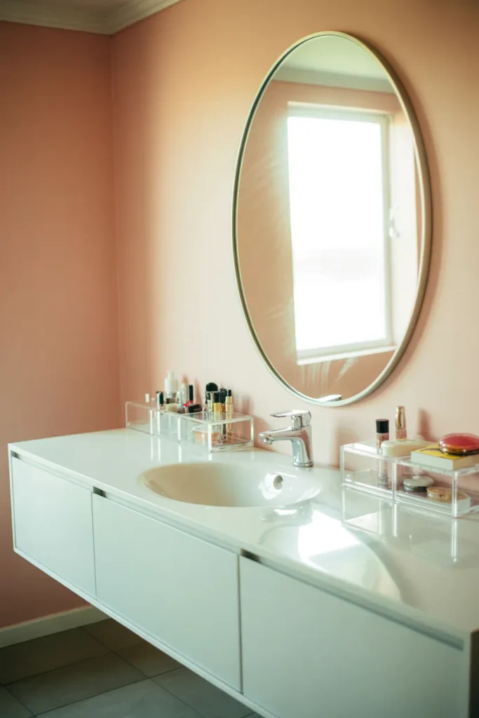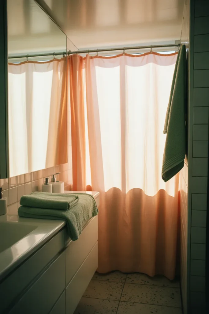To keep this palette from feeling flat, layer textures rather than adding more color. A ribbed shower curtain or matte ceramic accessories create depth without clutter. The most common mistake is choosing a neon shade instead of a muted blush. Stick to soft undertones and let the warmth of natural light do the rest.