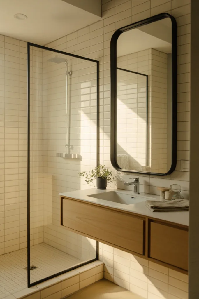 Design professionals often advise limiting black to frames and hardware. Too much can visually shrink a compact bathroom, while restrained use adds definition.