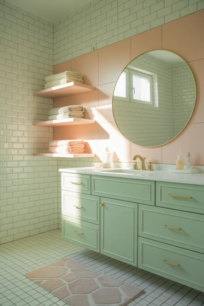 Bathrooms for Teens can be expressive without looking chaotic. A pastel palette inspired by Toca boca or even playful game worlds like Bloxburg feels imaginative yet still polished. Add a hint of Pink or mint cabinetry, then balance it with clean white tile to keep the space feeling fresh and age-flexible.