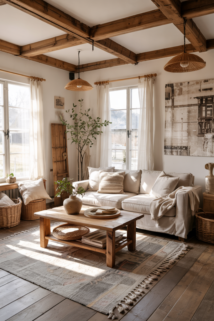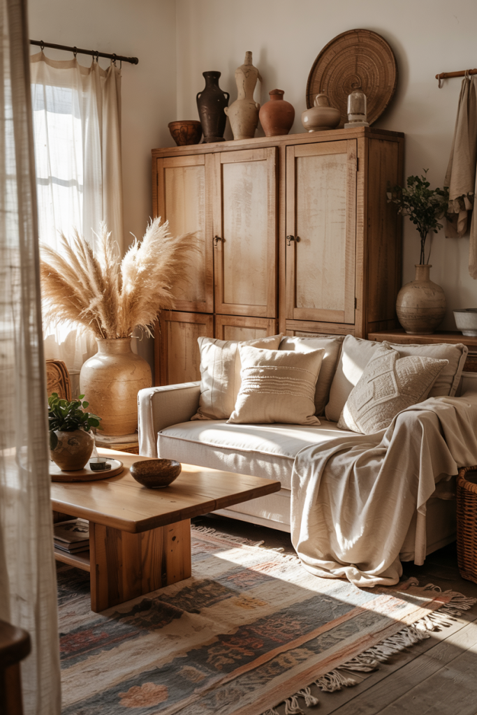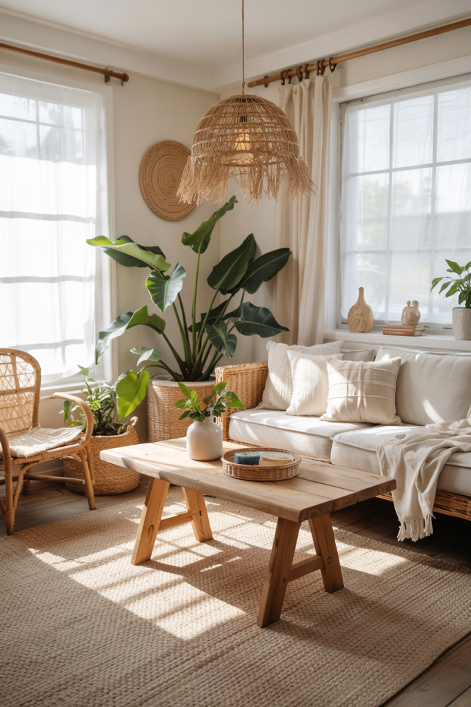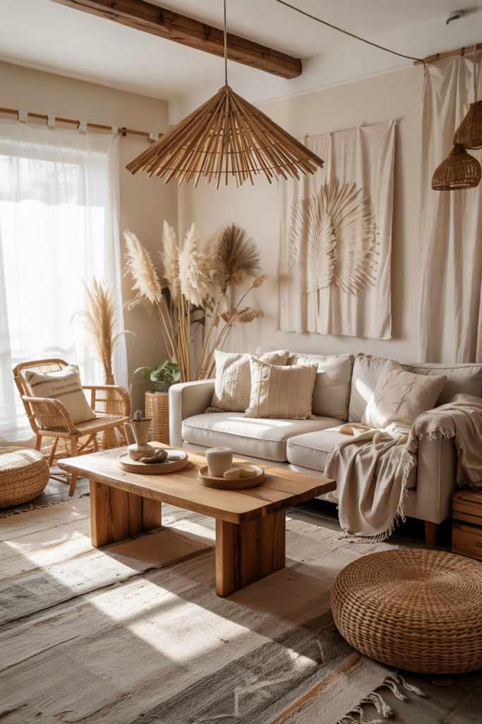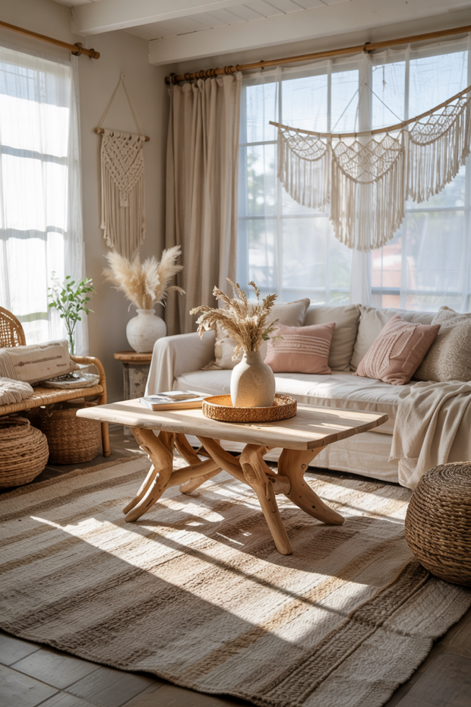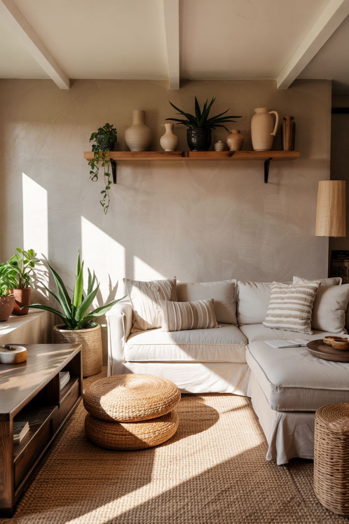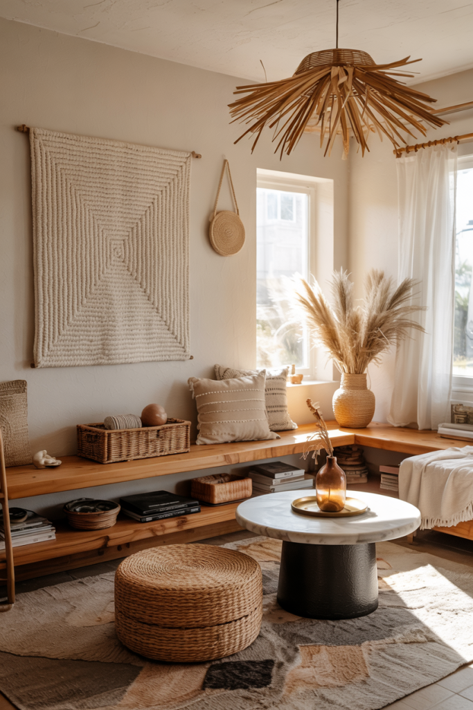 To make this look functional, bring in versatile pieces—like wide baskets for throws or a low bench for books. This keeps surfaces clear while preserving the relaxed energy. It’s a practical way to add personality without creating clutter, especially helpful for homes that balance aesthetics with everyday routines.