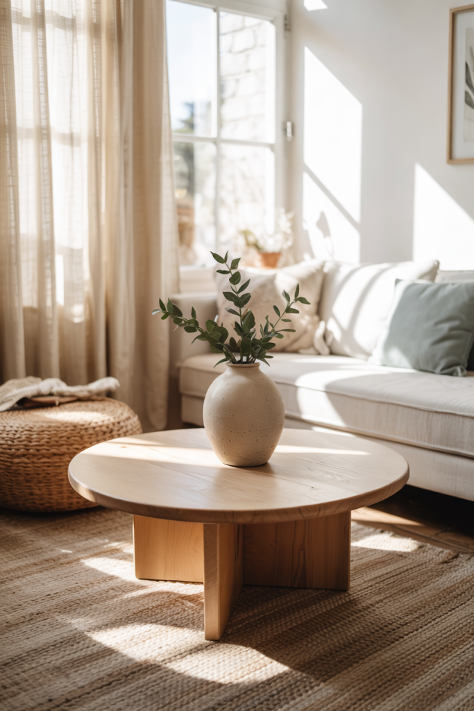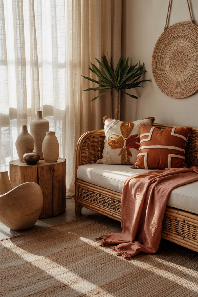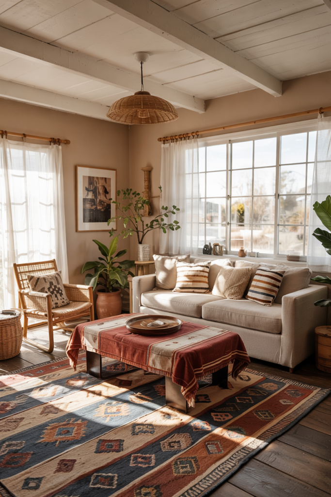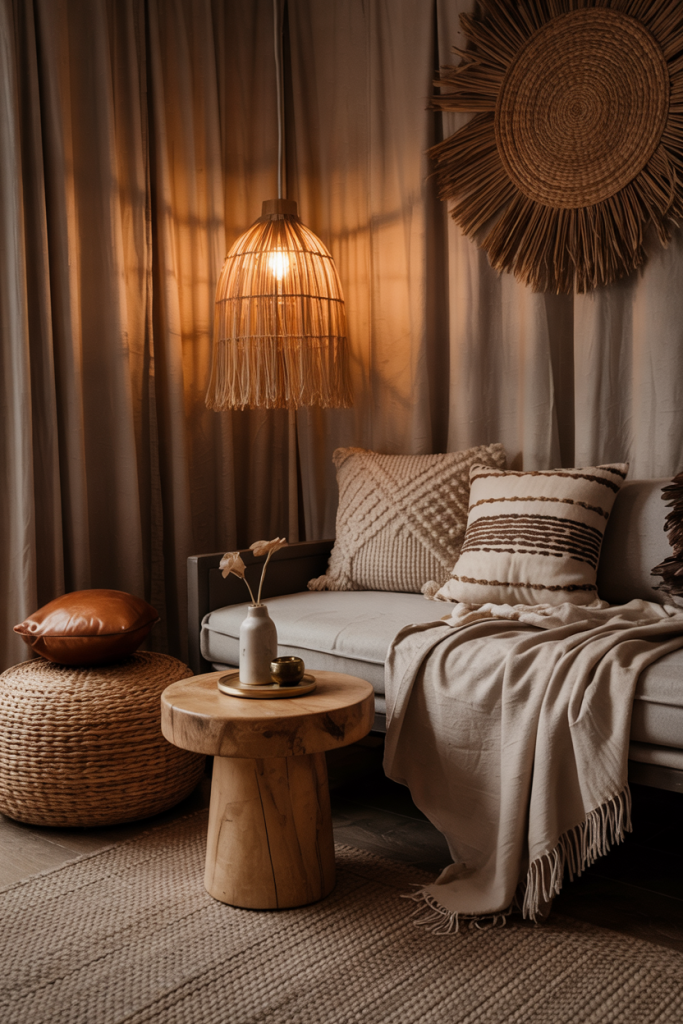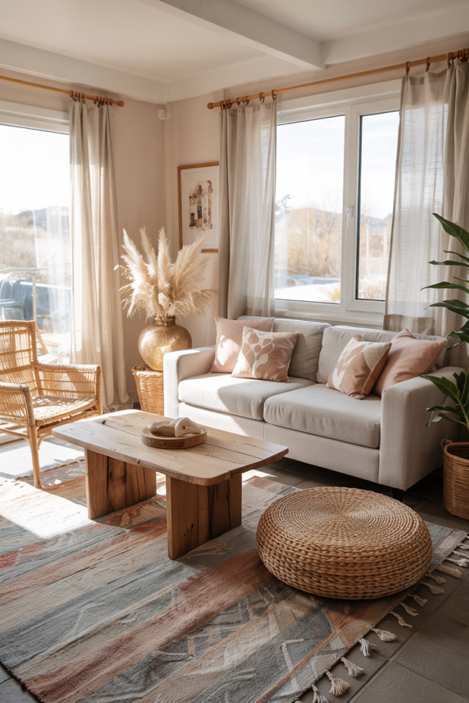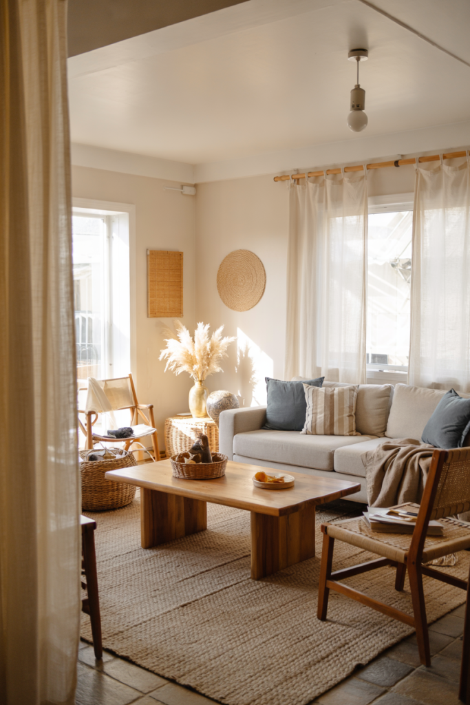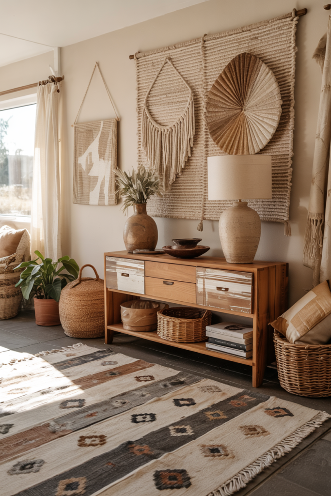 To make this look functional, bring in versatile pieces—like wide baskets for throws or a low bench for books. This keeps surfaces clear while preserving the relaxed energy. It’s a practical way to add personality without creating clutter, especially helpful for homes that balance aesthetics with everyday routines.