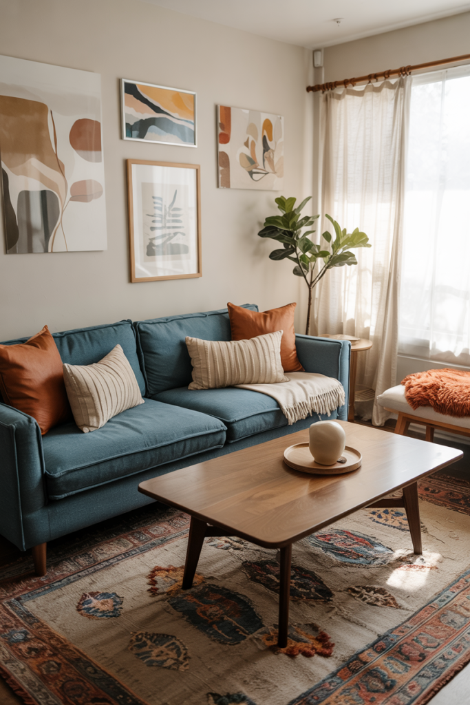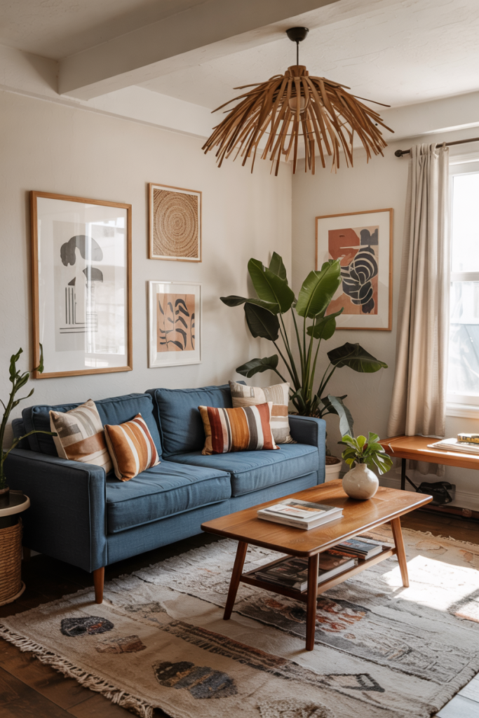 A standout element like a Blue couch can anchor the entire room. When combined with vintage art or sculptural décor, it leans gently toward a Mid century mood while staying boho-friendly. A mix of warm woods and woven textures keeps the look from drifting too polished or formal.