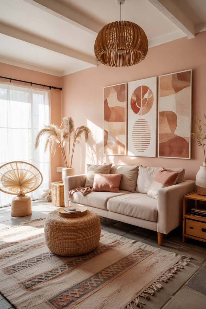 This idea mixes warm neutrals with subtle rosy tones, creating a gentle atmosphere that still feels grounded. A touch of Pink in pillows or art softens rustic edges, while muted finishes keep the look cohesive. Add sculptural pieces or woven accents for depth that feels relaxed rather than overly styled.