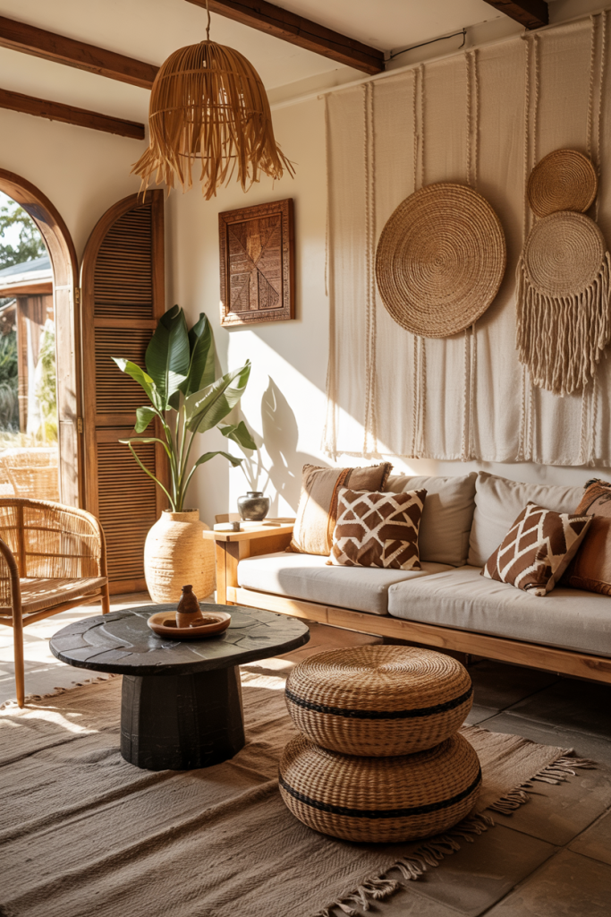 Handcrafted patterns and rich organic textures give this idea its soulful charm. Layering textiles or pottery with subtle African motifs creates warmth, while earthy surfaces keep the room grounded. Add a few Decor elements in natural fibers to enhance movement and rhythm without overwhelming the layout.