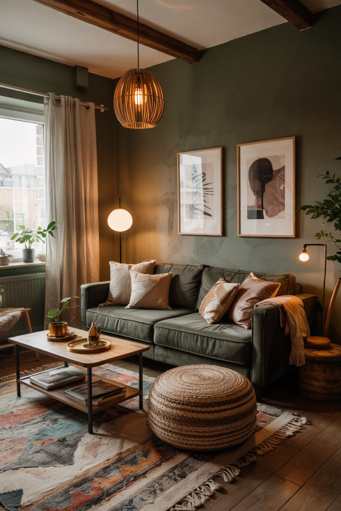 A playful palette turns the boho living room into a personal canvas. Pops of terracotta, mustard, or teal pair beautifully with a Vintage vibe, especially when inspired by subtly Colorful accessories. Add a statement piece like a bold lamp or cushion to break up neutrals while maintaining that loose, artistic charm. Even small rooms can carry this approach effortlessly.