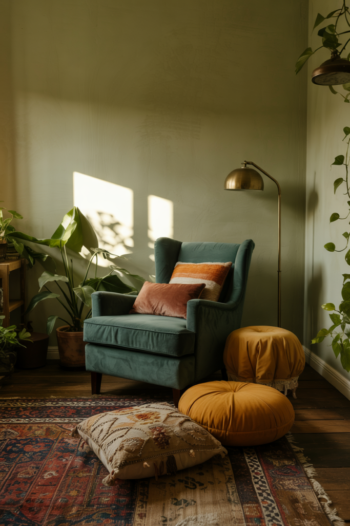 Deep greens create a refreshing yet dramatic backdrop for boho elements. Bringing in layers of Green textiles or artwork pairs beautifully with a Moody palette, keeping the space sophisticated while still relaxed. Warm woods and natural fibers soften the look and make it feel lived-in.