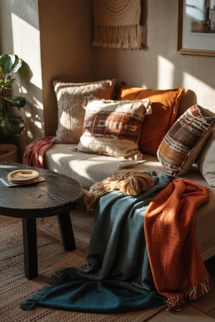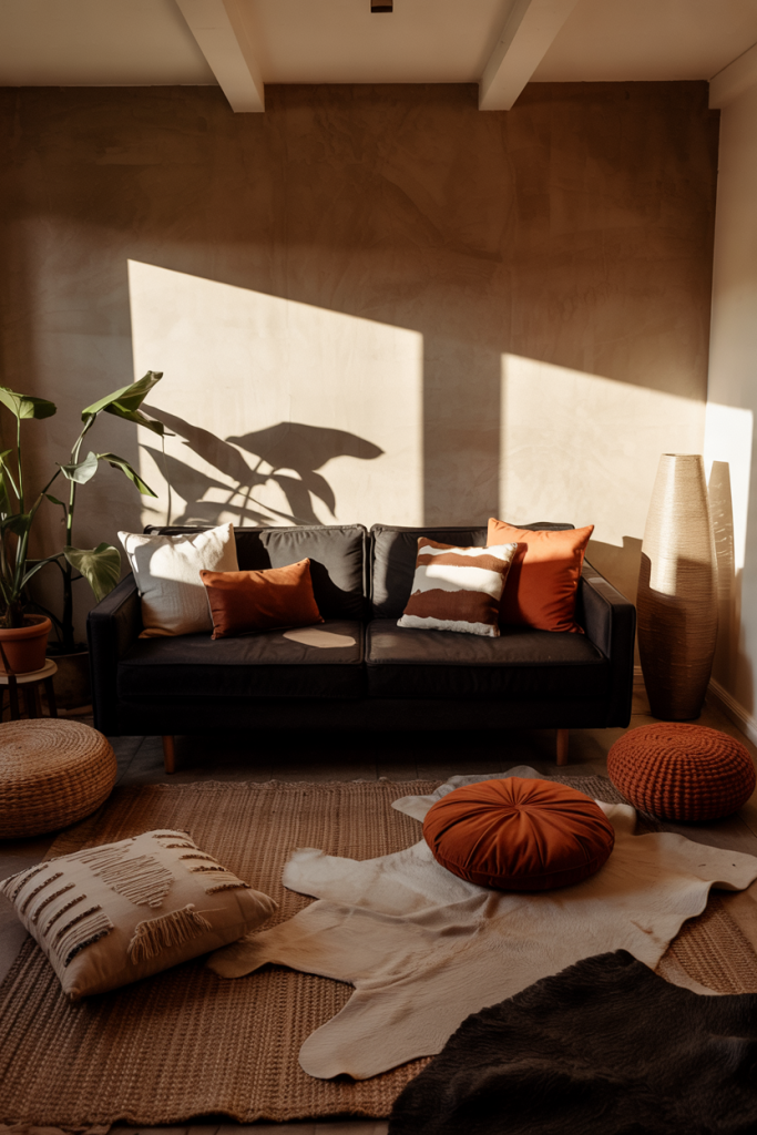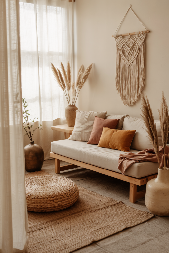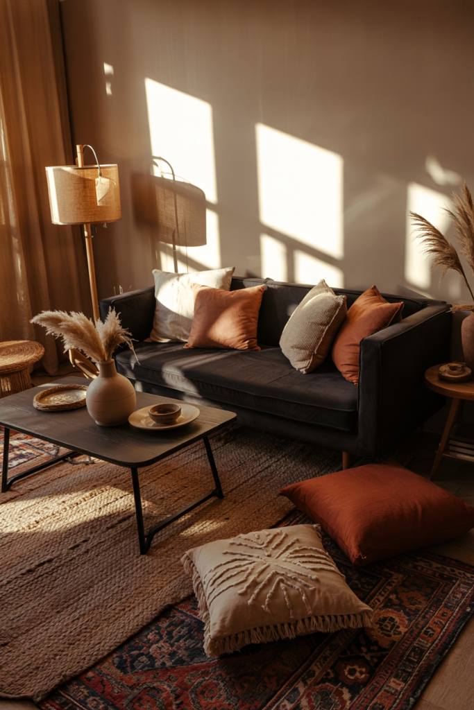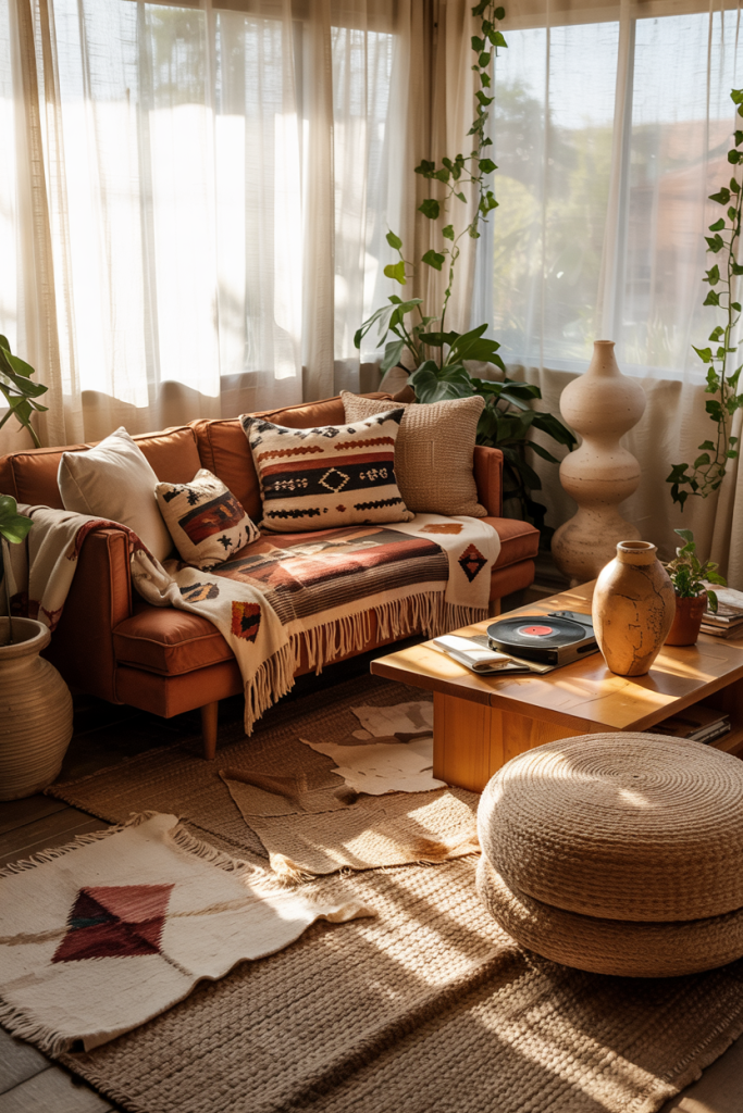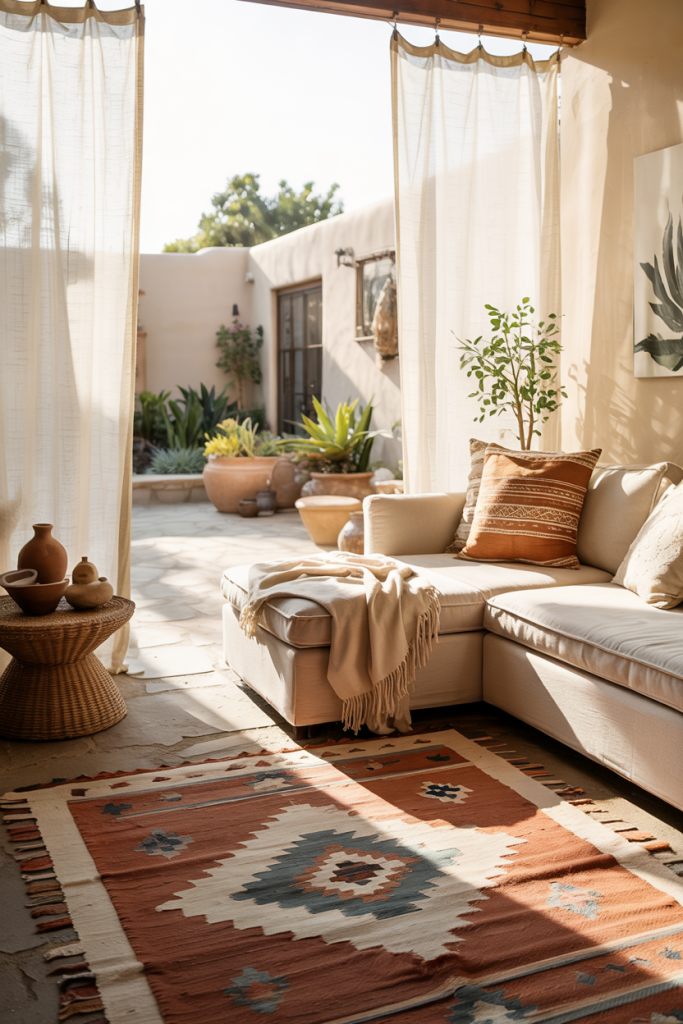 This idea blends desert warmth with relaxed boho shapes. Soft fabrics in sand and clay tones pair well with subtle Western details, while handwoven pieces add depth. A touch of Cozy texture in pillows or layering rugs brings comfort without straying from a gentle, natural rhythm. It’s a style that feels instantly calming after a long day.