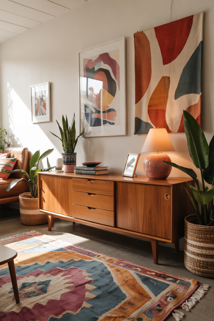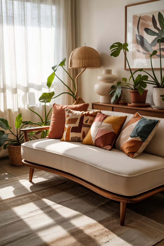 A streamlined aesthetic blends perfectly with boho layers when handled with restraint. Tapered legs, low seating, and curved silhouettes introduce Mid century charm, while pops of Colorful cushions keep the look warm and playful. Light woods ensure the room remains bright and approachable.