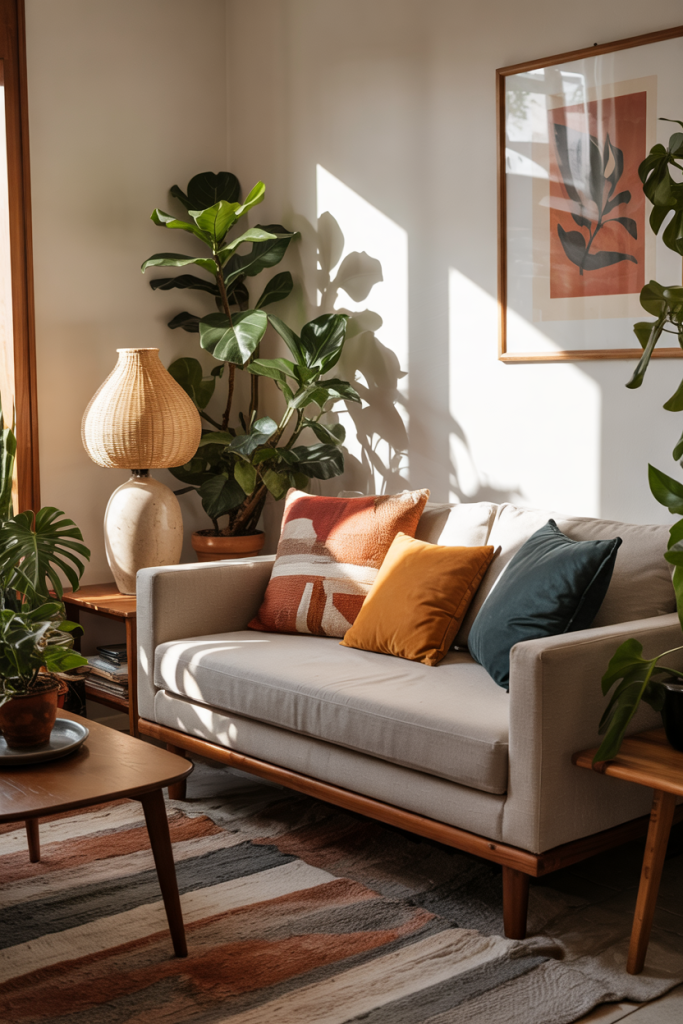 The budget angle here is simple: choose mid-century-style reproduction pieces. They cost significantly less than originals yet still deliver that clean, iconic shape that blends beautifully with boho textures.