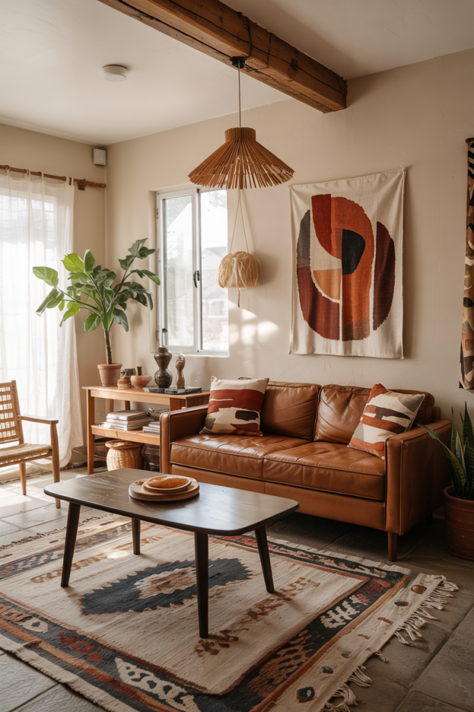 For open-concept homes, blending airy boho shapes with soft Western textures creates a harmonious flow. Add distressed leather, woven accents, or clay-toned ceramics to bring depth, while tonal rugs help define areas. A hint of Earthy décor keeps everything warm and cohesive.