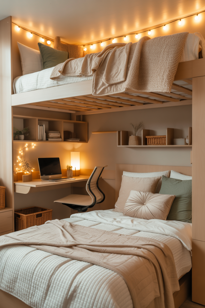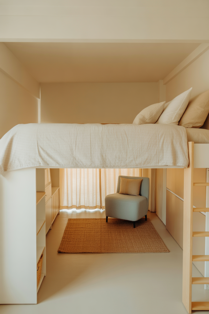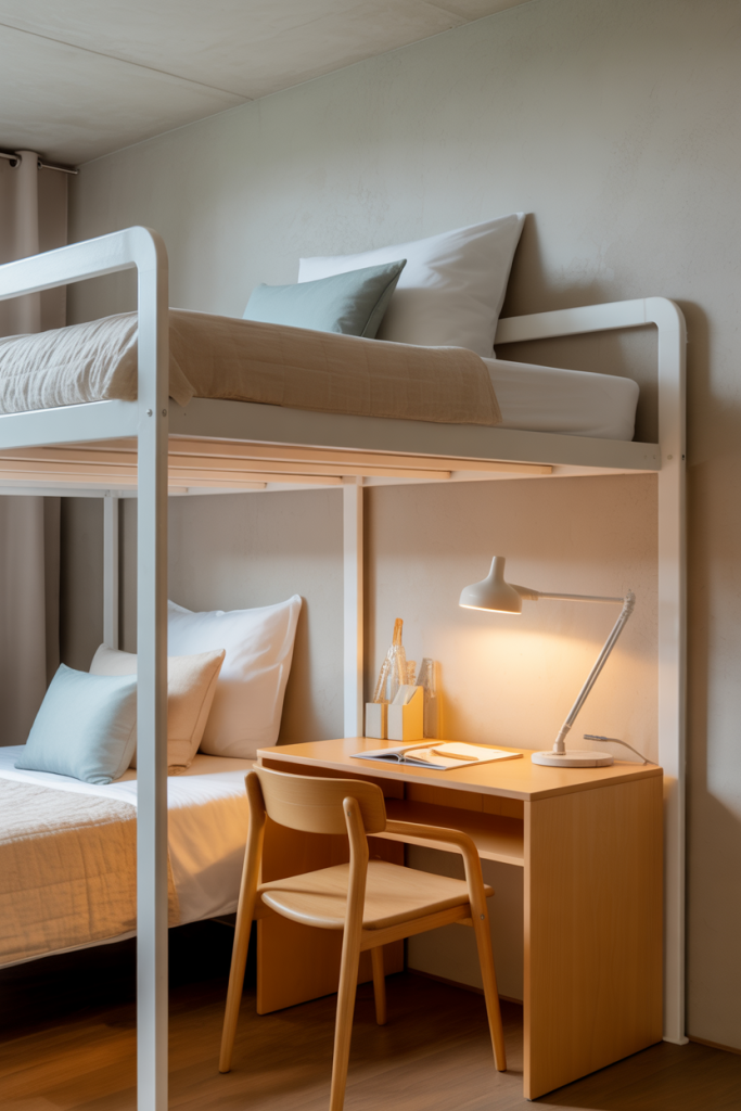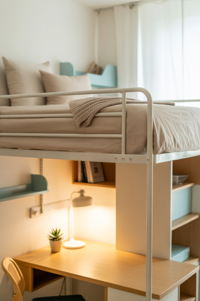 When space is tight, elevate the layout with a thoughtfully designed lofted beds aesthetic. Mix a soft neutral palette with one accent color like blue or pink. Add minimal aesthetic décor underneath the loft — think a compact reading corner or study zone that feels intentional rather than improvised.