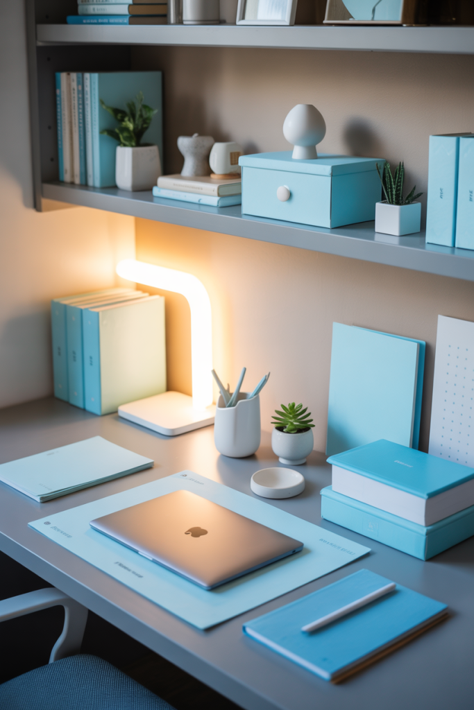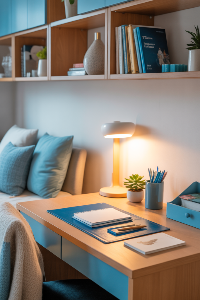 A focused study zone with soft cozy blue and light blue accents feels refreshing and calm, especially for long work sessions. Add a few cute desk accessories and balance them with neutral shelving to avoid visual clutter. A touch of blue in a rug or curtain pulls the whole layout together.