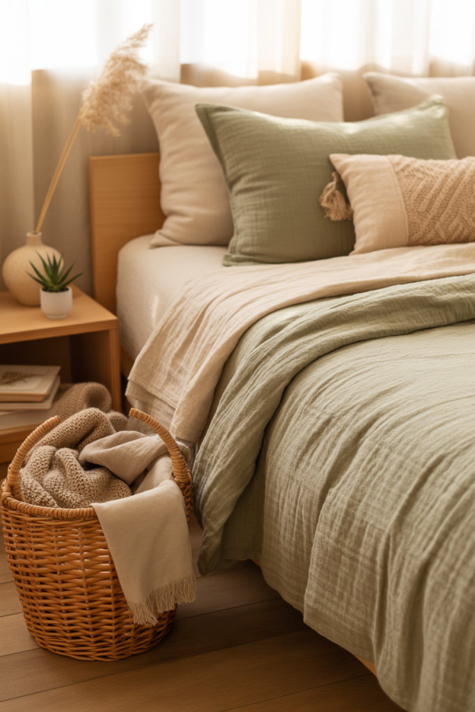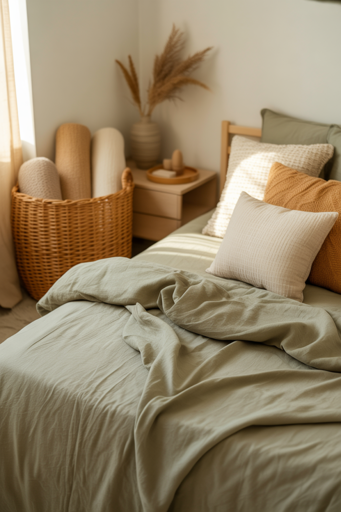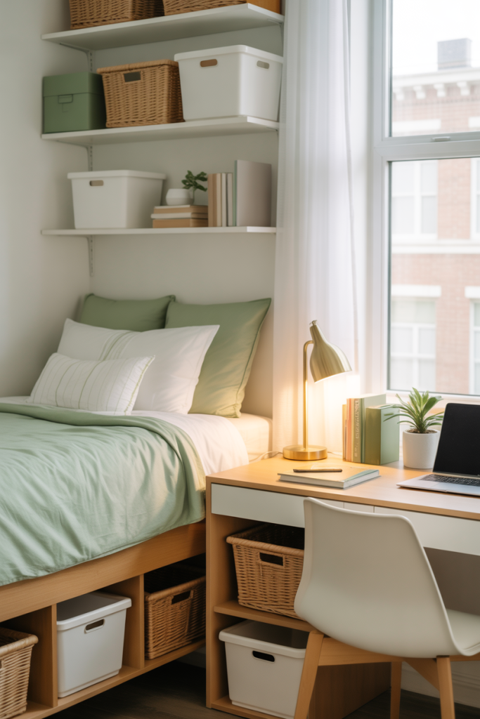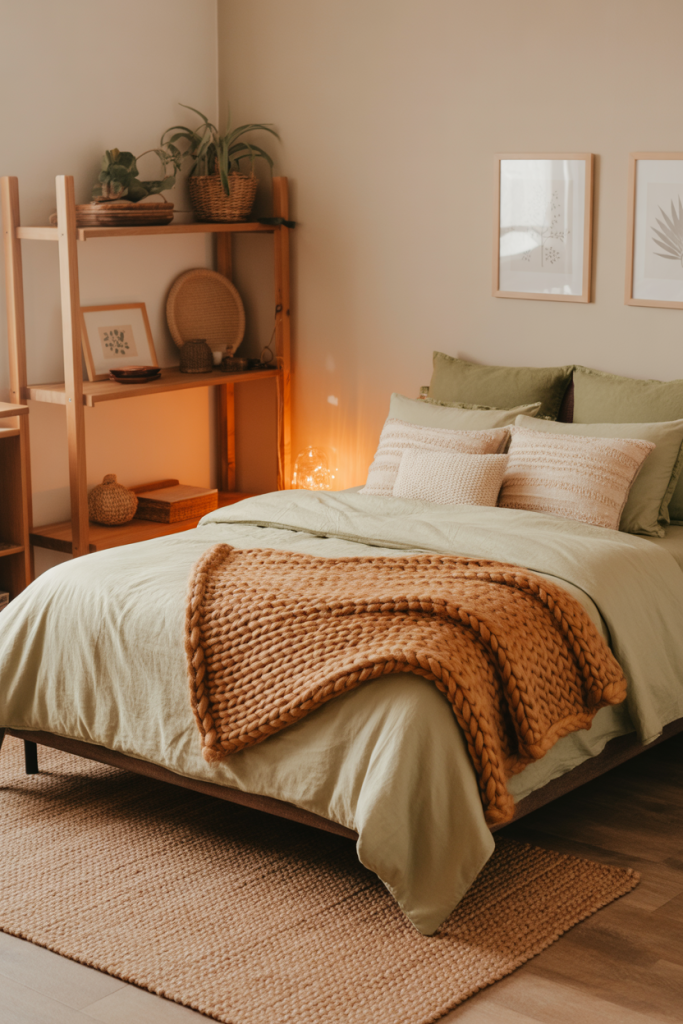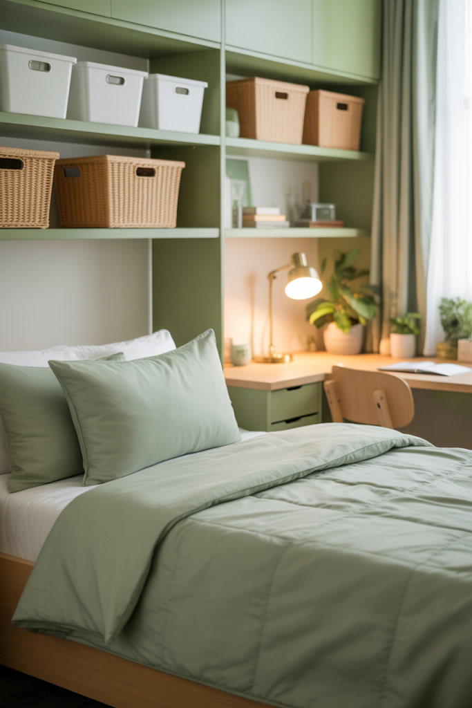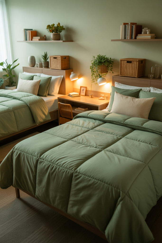 For those who love natural palettes, a soothing mix of green bedding and aesthetic earthy textures feels grounded and serene. Add a rustic woven basket and one smooth accent tone like sand or beige. A gentle earthy foundation helps a dorm feel less temporary and more like home.