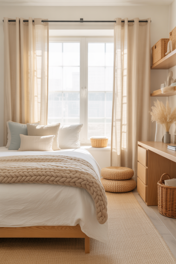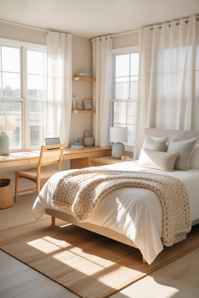 A breezy, beachy aesthetic brings a sense of escape to even the smallest dorms. Mix pale sand tones with one cool shade like blue or muted green and blue accents. Add a cozy throw in a textured knit to make the room feel soft while still keeping the palette airy and balanced.